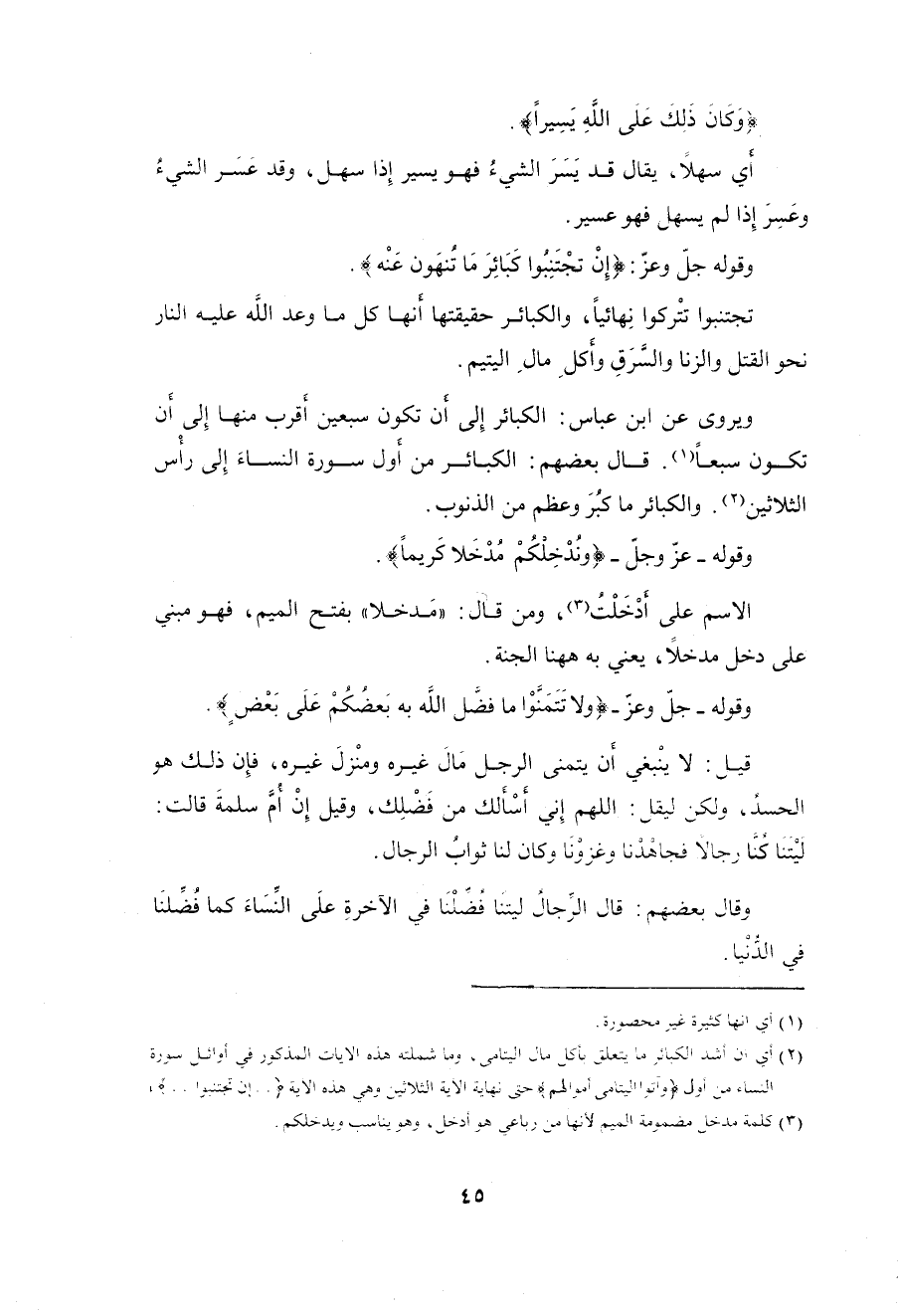 وقوله جلَّ وعزَّ: (إِنْ تَجْتَنِبُوا كَبَائِرَ مَا تُنْهَوْنَ عَنْهُ نُكَفِّرْ عَنْكُمْ سَيِّئَاتِكُمْ وَنُدْخِلْكُمْ مُدْخَلًا كَرِيمًا (31)
