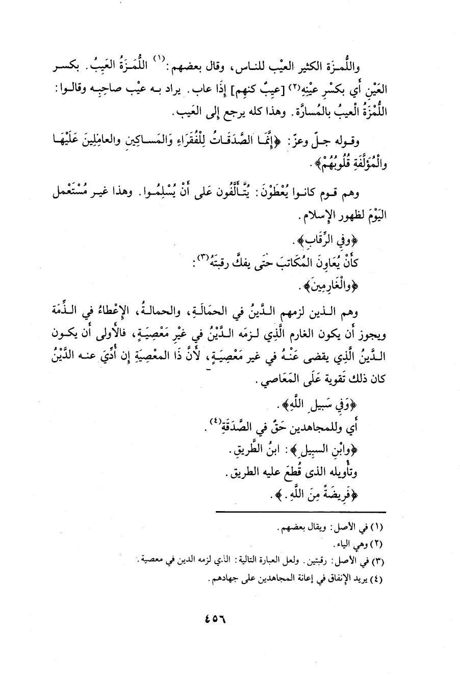 وقوله جلَّ وعزَّ: (إِنَّمَا الصَّدَقَاتُ لِلْفُقَرَاءِ وَالْمَسَاكِينِ وَالْعَامِلِينَ عَلَيْهَا وَالْمُؤَلَّفَةِ قُلُوبُهُمْ وَفِي الرِّقَابِ وَالْغَارِمِينَ وَفِي سَبِيلِ اللَّهِ وَابْنِ السَّبِيلِ فَرِيضَةً مِنَ اللَّهِ وَاللَّهُ عَلِيمٌ حَكِيمٌ (60)