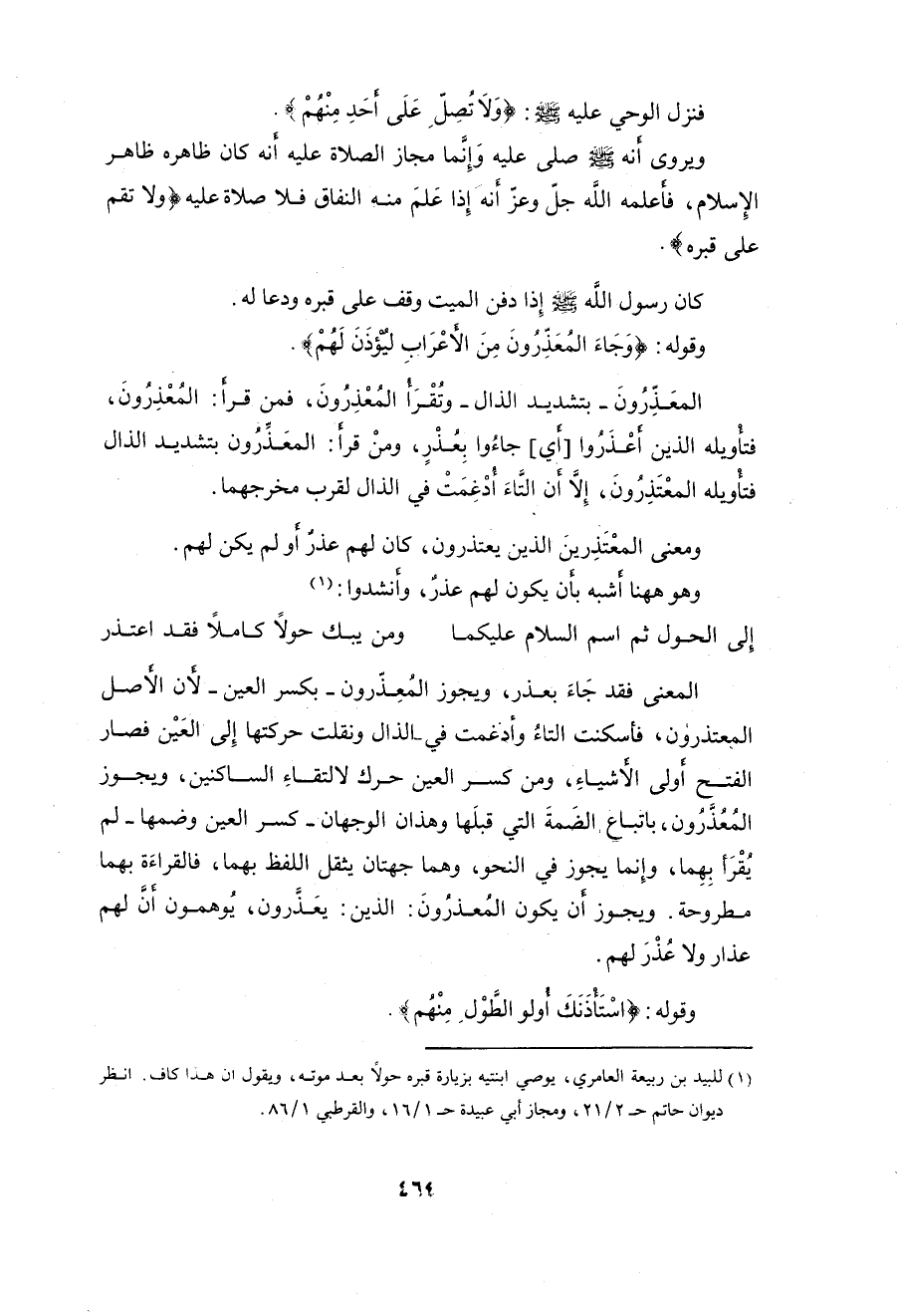 المعتذرون، فأسكنت التاءُ وأدْغمت في - الذال ونقلت حركتها إِلى العَيْن فصار الفتح أولى الأشياءِ، ومن كسر العين حرك لالتقاءِ السَّاكنين، ويجوز
