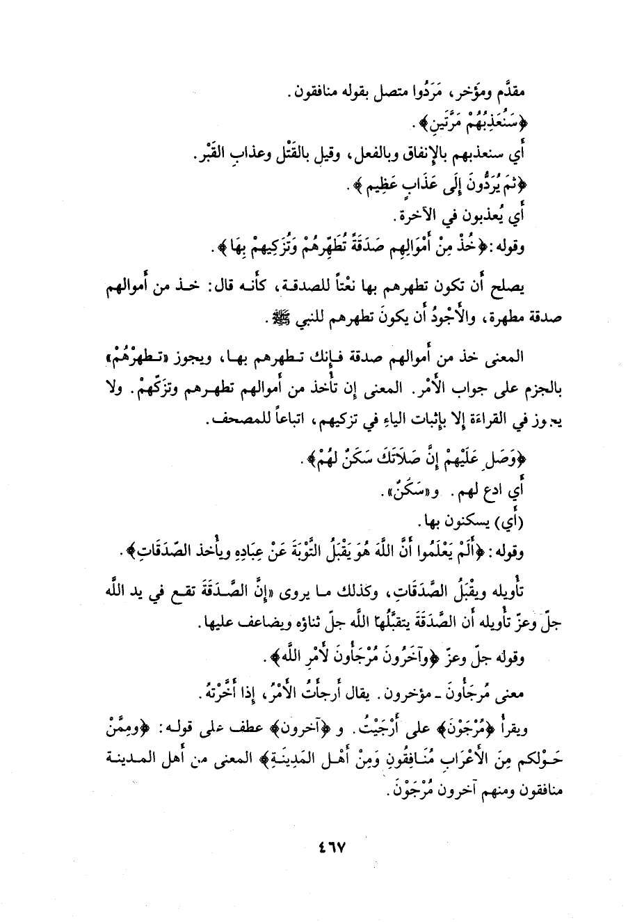وقوله: (خُذْ مِنْ أَمْوَالِهِمْ صَدَقَةً تُطَهِّرُهُمْ وَتُزَكِّيهِمْ بِهَا وَصَلِّ عَلَيْهِمْ إِنَّ صَلَاتَكَ سَكَنٌ لَهُمْ وَاللَّهُ سَمِيعٌ عَلِيمٌ (103)