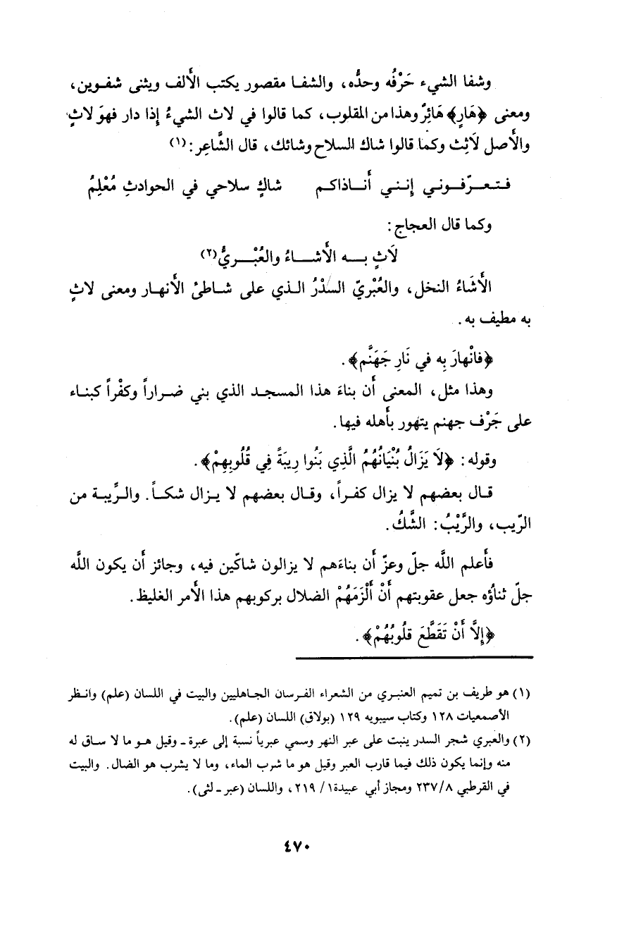 ومعنى (هَارٍ) هَائِر وهذا من المقلوب، كما قالوا في لاث الشيءُ إذا دار فهوَ لاثٍ والأصل لَائث وكما قالوا شاك السلاح وشائك.