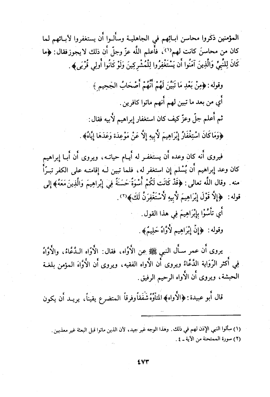 (وَمَا كَانَ اسْتِغْفَارُ إِبْرَاهِيمَ لِأَبِيهِ إِلَّا عَنْ مَوْعِدَةٍ وَعَدَهَا إِيَّاهُ فَلَمَّا تَبَيَّنَ لَهُ أَنَّهُ عَدُوٌّ لِلَّهِ تَبَرَّأَ مِنْهُ إِنَّ إِبْرَاهِيمَ لَأَوَّاهٌ حَلِيمٌ (114)