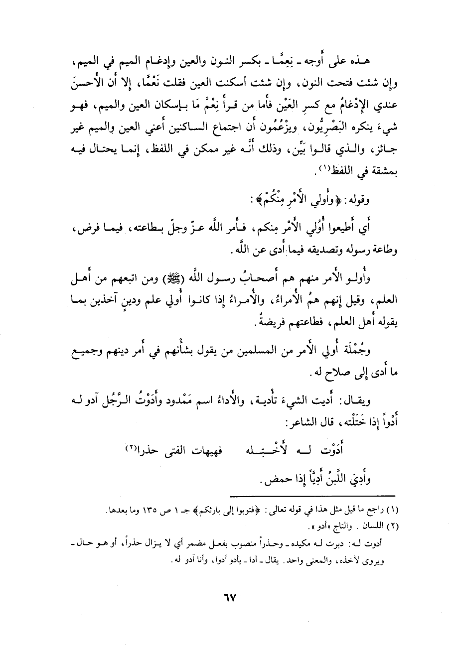 وأولو الأمر منهم هم أصحابُ رسول الله - صلى الله عليه وسلم - ومن اتبعهم من أهل العلم، وقيل إِنهم همُ الأمراءُ، والأمراءُ إِذا كانوا أولي علم ودينٍ آخذين بما يقوله أهل العلم، فطاعتهم فريضةٌ.