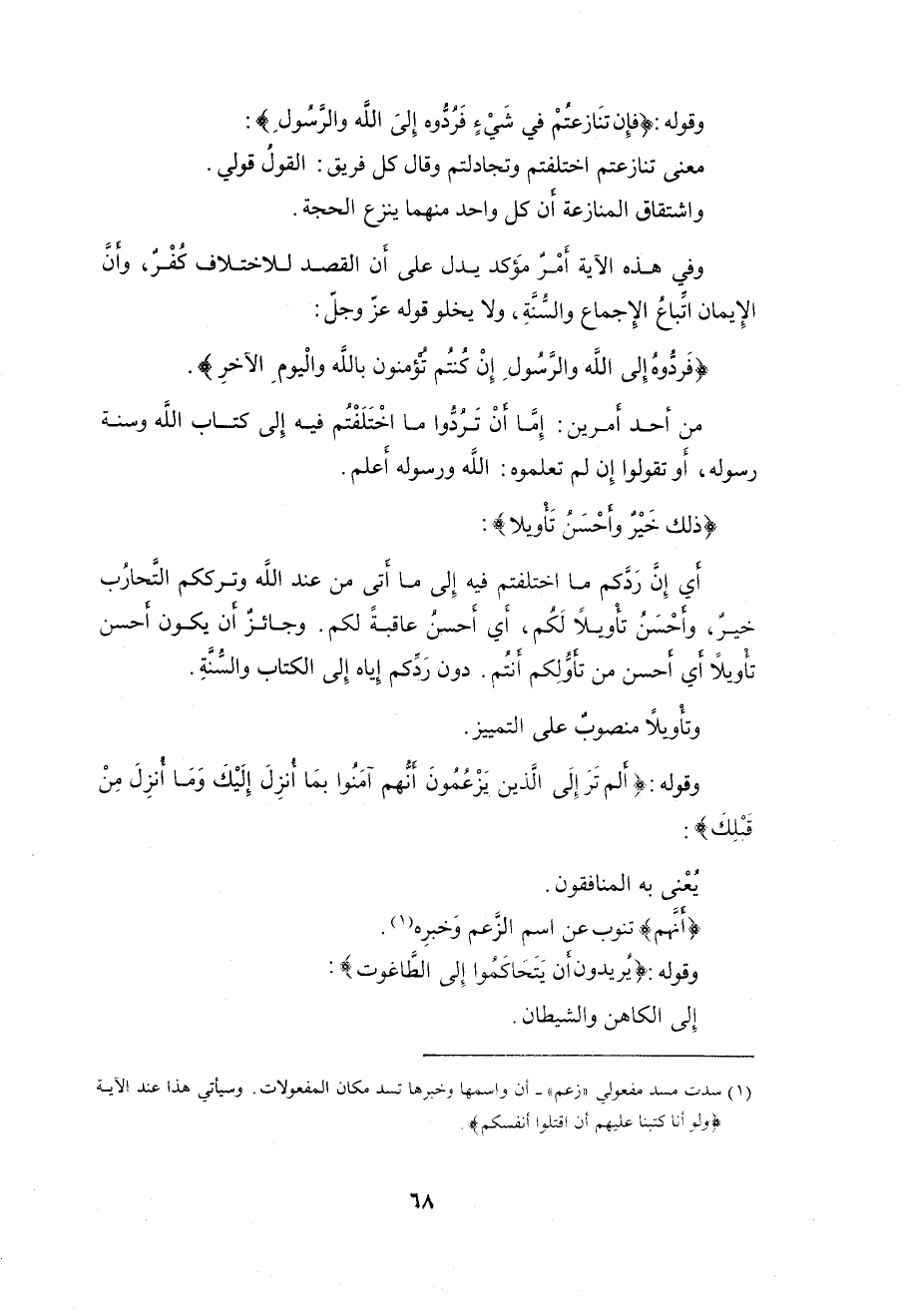 وقوله: (فَإِنْ تَنَازَعْتُمْ فِي شَيْءٍ فَرُدُّوهُ إِلَى اللَّهِ وَالرَّسُولِ)
