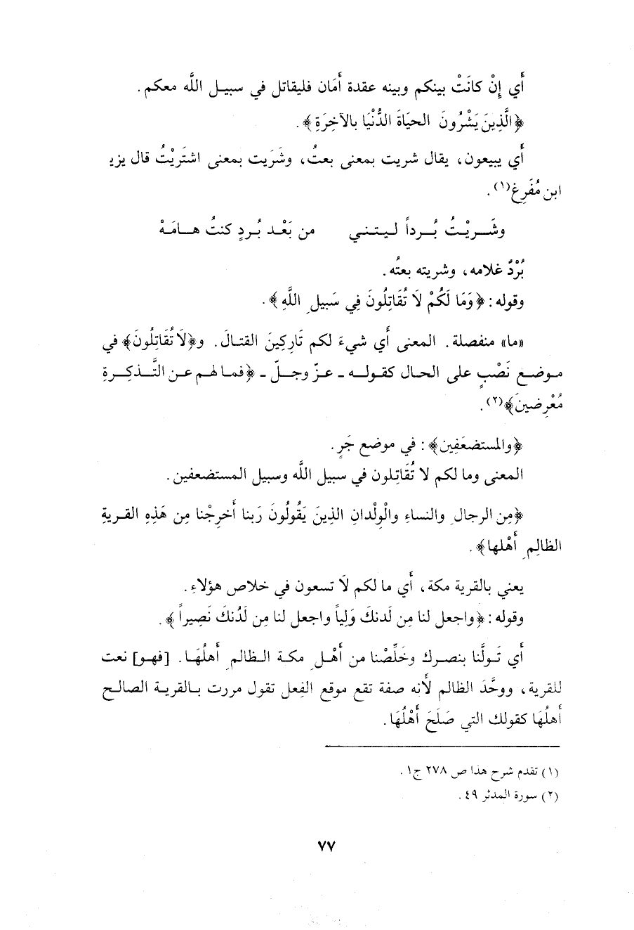 وقوله: (وَمَا لَكُمْ لَا تُقَاتِلُونَ فِي سَبِيلِ اللَّهِ وَالْمُسْتَضْعَفِينَ مِنَ الرِّجَالِ وَالنِّسَاءِ وَالْوِلْدَانِ الَّذِينَ يَقُولُونَ رَبَّنَا أَخْرِجْنَا مِنْ هَذِهِ الْقَرْيَةِ الظَّالِمِ أَهْلُهَا وَاجْعَلْ لَنَا مِنْ لَدُنْكَ وَلِيًّا وَاجْعَلْ لَنَا مِنْ لَدُنْكَ نَصِيرًا (75)