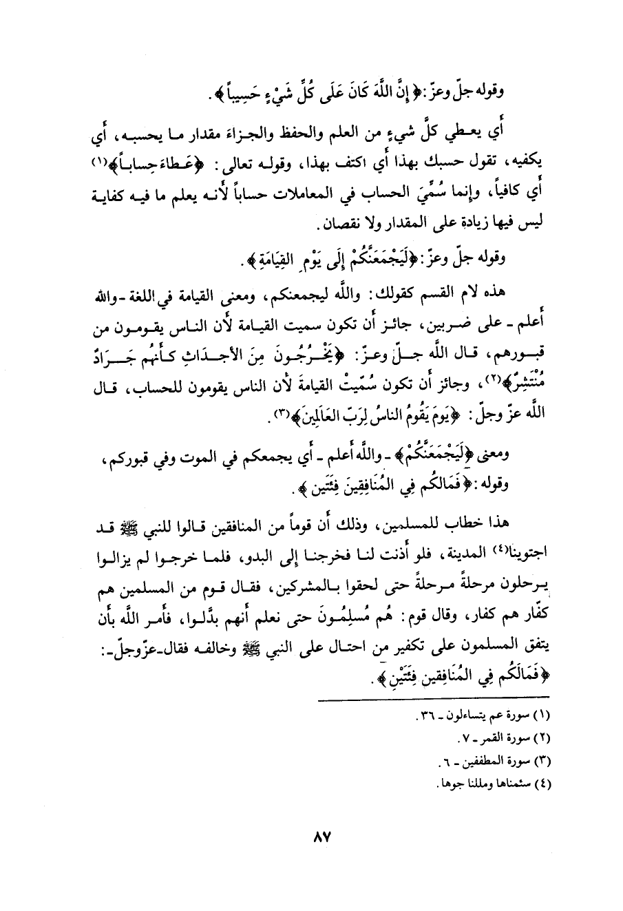 وقوله جلَّ وعزَّ: (اللَّهُ لَا إِلَهَ إِلَّا هُوَ لَيَجْمَعَنَّكُمْ إِلَى يَوْمِ الْقِيَامَةِ لَا رَيْبَ فِيهِ وَمَنْ أَصْدَقُ مِنَ اللَّهِ حَدِيثًا (87)