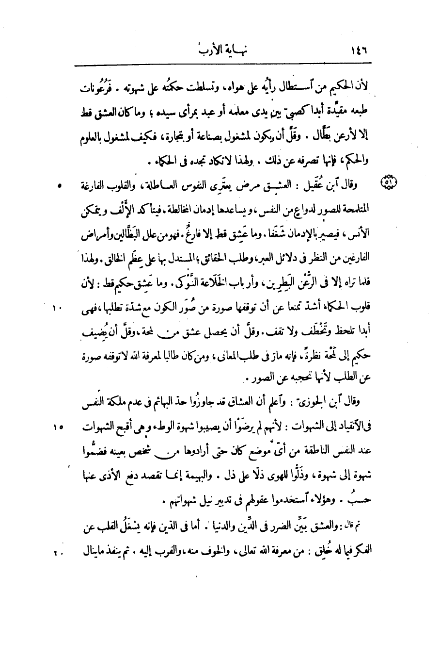 وقال ابن عقيل: العشق مرض يعترى النفوس العاطلة، والقلوب الفارغة المتلمحة للصور لدواع من النفس، ويساعدها إدمان المخالطة، فيتأكد الإلف ويتمكن الأنس، فيصير بالإدمان شغفا. وما عشق قط إلا فارغ. فهو من علل البظّالين وأمراض الفارغين من النظر في دلائل العبر، وطلب الحقائق؛ المستدل بها على عظم الخالق. ولهذا قلما تراه إلا في الرّعن البطرين، وأرباب الخلاعة النّوكى. وما عشق حكيم قط: لأن قلوب الحكماء أشدّ تمنعا عن أن توقفها صورة من صور الكون مع شدّة تطلبها، فهى أبدا تلحظ وتخطف ولا تقف. وقلّ أن يحصل عشق من لمحة، وقلّ أن يضيف حكيم إلى لمحة نظرة، فإنه مارّ في طلب المعانى، ومن كان طالبا لمعرفة الله لا توقفه صورة عن الطلب لأنها تحجبه عن الصور.