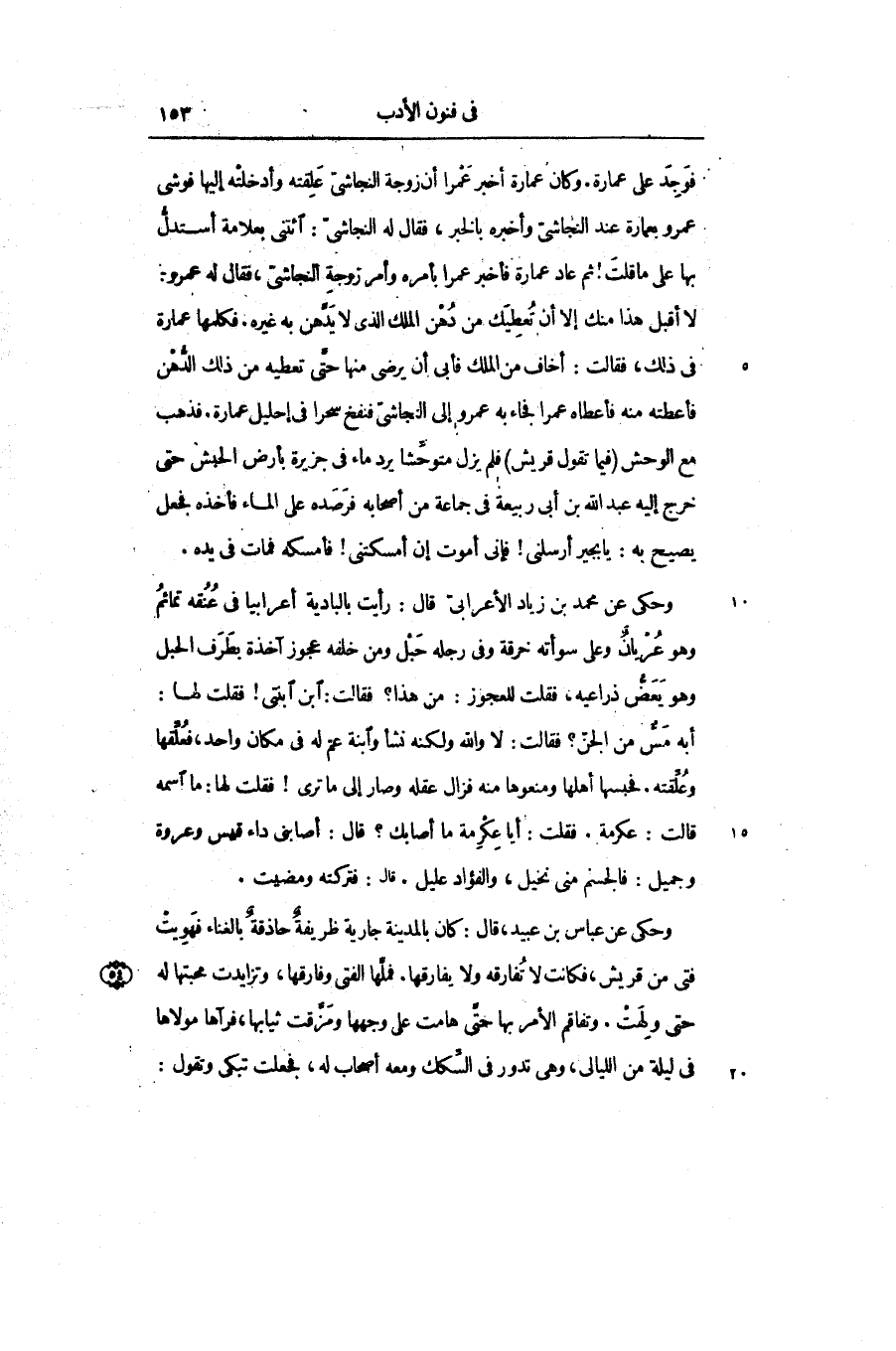 أبه مسّ من الجنّ؟ فقالت: لا والله ولكنه نشأ وابنة عمّ له في مكان واحد، فعلّقها وعلّقته. فحبسها أهلها ومنعوها منه فزال عقله وصار إلى ما ترى! فقلت لها: ما اسمه قالت: عكرمة. فقلت: أيا عكرمة ما أصابك؟ قال: أصابنى داء قيس وعروة وجميل: فالجسم منى نخيل، والفؤاد عليل. قال: فتركته ومضيت.