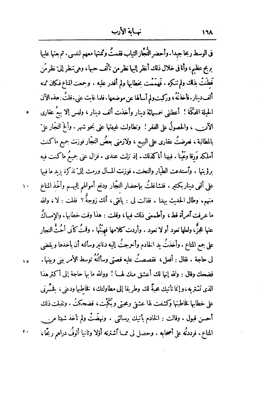 فضحك وقال: والله إنها لك أعشق منك لها! وو الله ما بها حاجة إلى أكثر هذا الذى تشتريه، وإنما تأتيك محبة لك وطريقا إلى مطاولتك، فخاطبها ودعنى، فجسّرنى على خطابها فخاطبتها وكشفت لها عشقى ومحبتى وبكيت، فضحكت. وتقبلت ذلك أحسن قبول. وقالت: الخادم يأتيك برسالتى. ونهضت ولم تأخذ شيئا من المتاع، فرددته على أصحابه. وحصل لى مما اشترته أوّلا وثانيا ألوف دراهم ربحا،