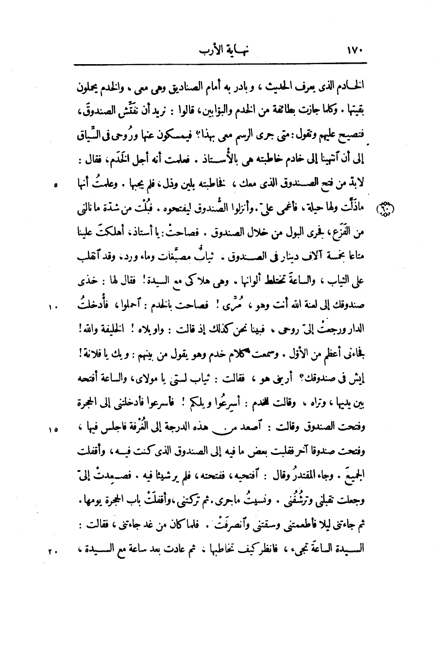 لا بدّ من فتح الصندوق الذى معك، فخاطبته بلين وذل، فلم يجبها. وعلمت أنها ما ذلّت ولها حيلة، فأغمى علىّ. وأنزلوا الصّندوق ليفتحوه. فبلت من شدّة ما نالنى من الفزع، فجرى البول من خلال الصندوق. فصاحت: يا أستاذ، أهلكت علينا متاعا بخمسة آلاف دينار في الصندوق. ثياب مصبّغات وماء ورد، وقد انقلب على الثياب، والساعة تختلط ألوانها، وهى هلاكى مع السيدة! فقال لها: خذى صندوقك إلى لعنة الله أنت وهو، مرّى! فصاحت بالخدم: احملوا، فأدخلت الدار ورجعت إلىّ روحى، فبينا نحن كذلك إذ قالت: وا ويلاه! الخليفة والله! فجاءنى أعظم من الأوّل. وسمعت كلام خدم وهو يقول من بينهم: ويك يا فلانة! إيش في صندوقك؟ أرينى هو، فقالت: ثياب لستى يا مولاى، والساعة أفتحه بين يديها، وتراه، وقالت للخدم: أسرعوا ويلكم! فأسرعوا فأدخلتنى إلى الحجرة وفتحت الصندوق وقالت: اصعد من هذه الدرجة إلى الغرفة فاجلس فيها، وفتحت صندوقا آخر فقلبت بعض ما فيه إلى الصندوق الذى كنت فيه، وأقفلت الجميع. وجاء المقتدر وقال: افتحيه، ففتحته، فلم ير شيئا فيه. فصعدت إلىّ وجعلت تقبلنى وترشفنى. ونسيت ما جرى. ثم تركتنى، وأقفلت باب الحجرة يومها.
