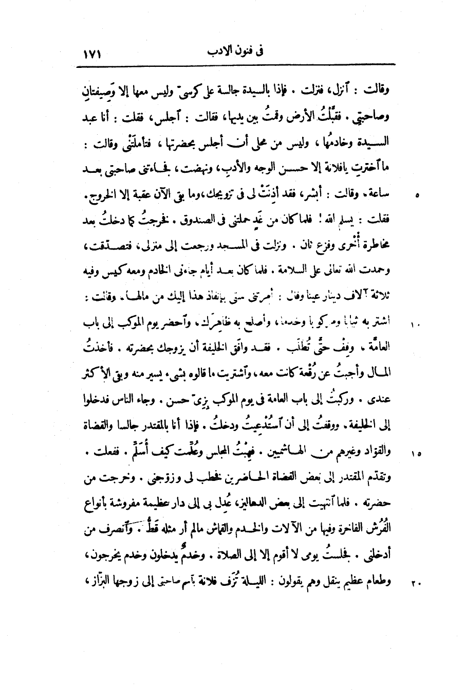 وقالت: انزل، فنزلت. فإذا بالسيدة جالسة على كرسىّ وليس معها إلا وصيفتان وصاحبتى. فقبّلت الأرض وقمت بين يديها، فقالت: اجلس، فقلت: أنا عبد السيدة وخادمها، وليس من محلى أن أجلس بحضرتها، فتأملتنى وقالت: