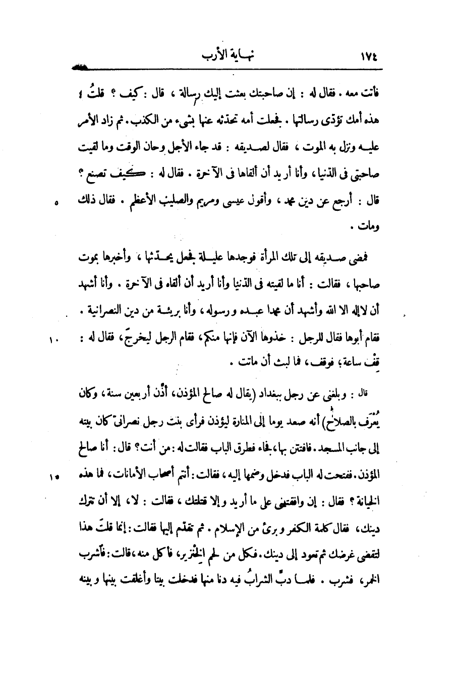 فمضى صديقه إلى تلك المرأة فوجدها عليلة فجعل يحدّثها، وأخبرها بموت صاحبها، فقالت: أنا ما لقيته في الدّنيا وأنا أريد أن ألقاه في الآخرة. وأنا أشهد أن لا إله إلا الله وأشهد أن محمدا عبده ورسوله، وأنا بريئة من دين النصرانية.