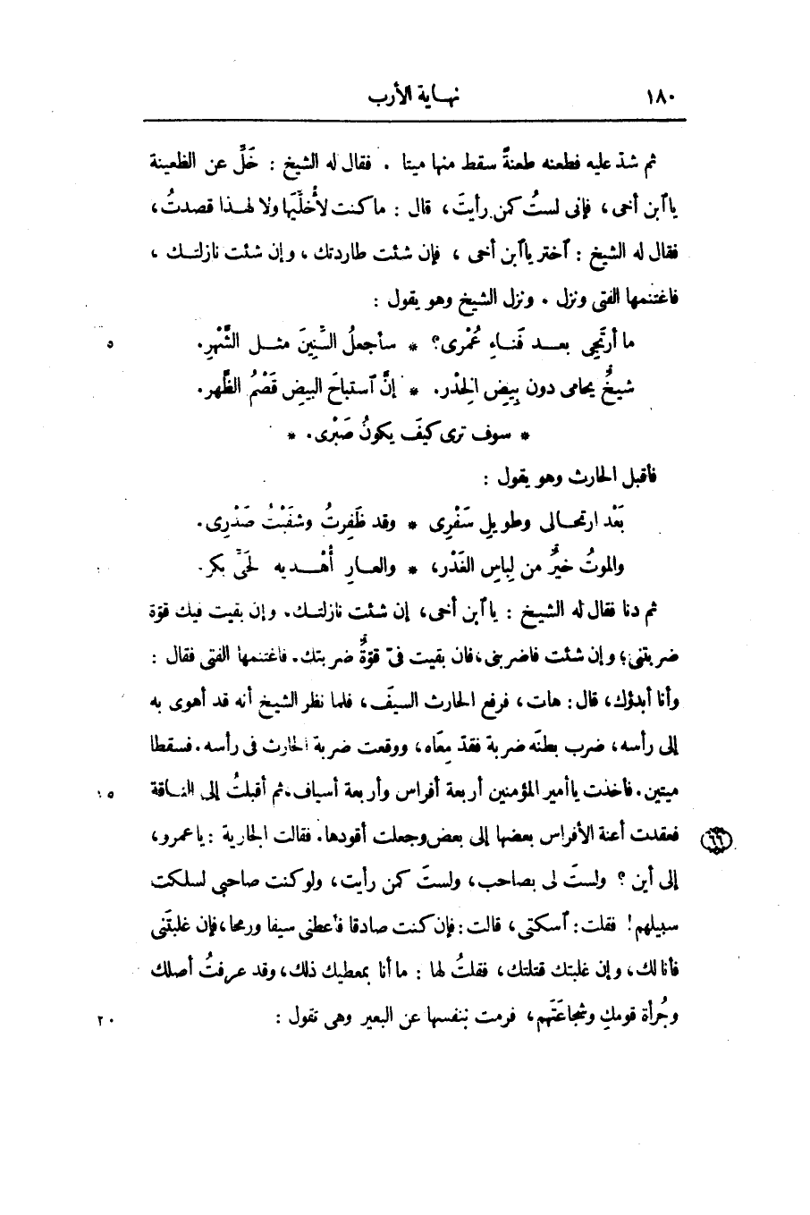 ثم شدّ عليه فطعنه طعنة سقط منها ميتا. فقال له الشيخ: خلّ عن الظعينة يا ابن أخى، فإنى لست كمن رأيت، قال: ما كنت لأخلّيها ولا لهذا قصدت، فقال له الشيخ: اختر يا ابن أخى، فإن شئت طاردتك، وإن شئت نازلتك، فاغتنمها الفتى ونزل. ونزل الشيخ وهو يقول: