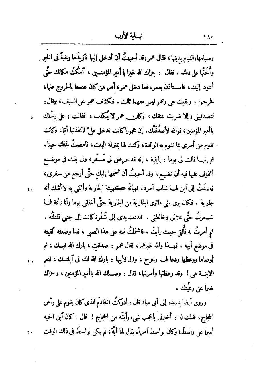 لتصدقينى وإلا ضربت عنقك، وكان عمر لا يكذب، فقالت: على رسلك يا أمير المؤمنين، فو الله لأصدقنّك. إن عجوزا كانت تدخل علىّ فاتخذتها أمّا، وكانت تقوم من أمرى بما تقوم به الوالدة، وكنت لها بمنزلة البنت، فأمضت بذلك حينا.