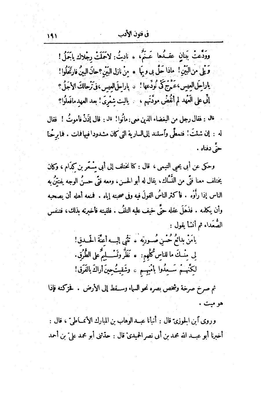وحكى عن أبى يحيى التيمى، قال: كنا نختلف إلى أبى مسعر بن كدام، وكان يختلف معنا فتى من النّسّاك، يقال له أبو الحسن، ومعه فتى حسن الوجه يفتتن به الناس إذا رأوه. فأكثر الناس القول فيه وفي صحبته إياه. فمنعه أهله أن يصحبه وأن يكلمه. فذهل عقله حتّى خيف عليه التلف. فلقيته فأخبرته بذلك، فتنفس الصّعداء ثم أنشأ يقول: