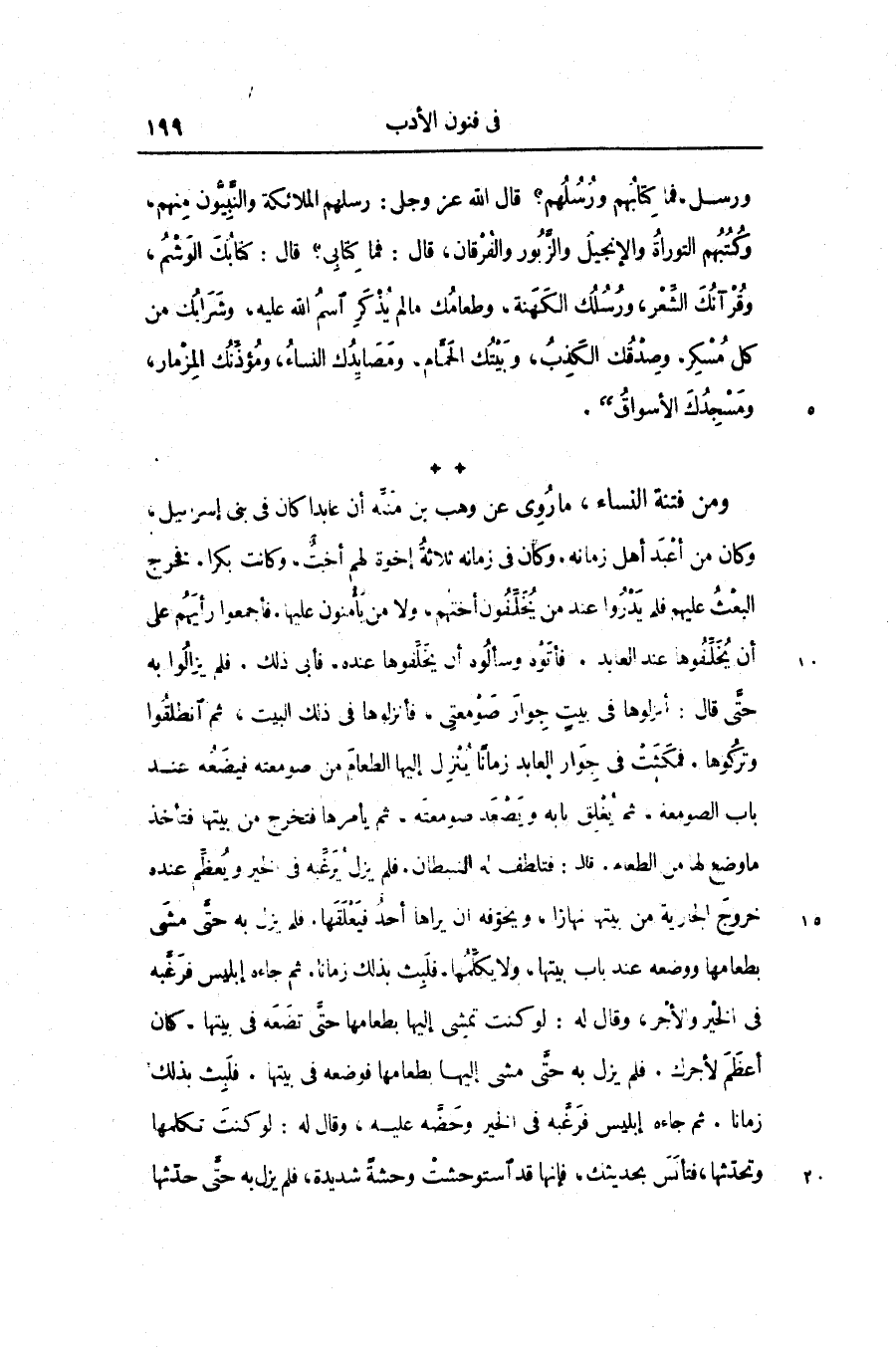 ومن فتنة النساء، ما روى عن وهب بن منبّه أن عابدا كان في بنى إسرائيل، وكان من أعبد أهل زمانه. وكان في زمانه ثلاثة إخوة لهم أخت، وكانت بكرا. فخرج البعث عليهم فلم يدروا عند من يخلّفون أختهم، ولا من يأمنون عليها، فأجمعوا رأيهم على أن يخلّفوها عند العابد. فأتوه وسألوه أن يخلّفوها عنده. فأبى ذلك. فلم يزالوا به حتّى قال: أنزلوها في بيت جوار صومعتى، فأنزلوها في ذلك البيت، ثم انطلقوا وتركوها. فمكثت في جوار العابد زمانا ينزل إليها الطعام من صومعته فيضعه عند باب الصومعة، ثم يغلق بابه ويصعد صومعته، ثم يأمرها فتخرج من بيتها فتأخذ ما وضع لها من الطعام. قال: فتلطف له النبطان. فلم يزل يرغّبه في الخير ويعظّم عنده خروج الجارية من بيتها نهارا، ويخوّفه ان يراها أحد فيعلقها. فلم يزل به حتّى مشى بطعامها ووضعه عند باب بيتها، ولا يكلّمها. فلبث بذلك زمانا. ثم جاءه إبليس فرغّبه فى الخير والأجر، وقال له: لو كنت تمشى إليها بطعامها حتّى تضعه في بيتها. كان أعظم لأجرك. فلم يزل به حتّى مشى إليها بطعامها فوضعه في بيتها. فلبث بذلك زمانا. ثم جاءه إبليس فرغّبه في الخير وحضّه عليه، وقال له: لو كنت تكلمها وتحدّثها، فتأنس بحديثك، فإنها قد استوحشت وحشة شديدة، فلم يزل به حتّى حدّثها