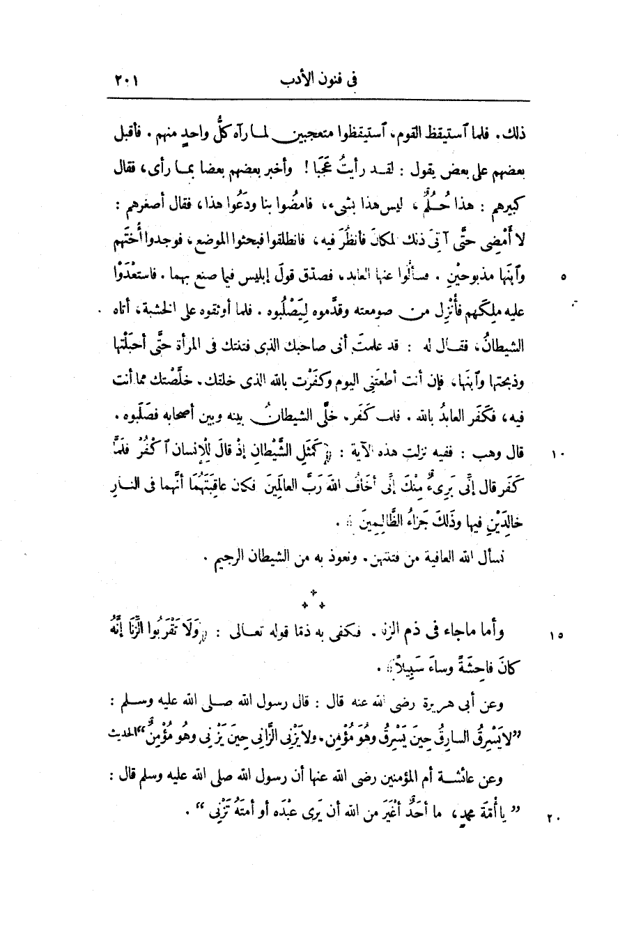 لا أمضى حتّى آتى ذلك لمكان فأنظر فيه، فانطلقوا فبحثوا الموضع، فوجدوا أختهم وابنها مذبوحين. فسألوا عنها العابد، فصدّق قول إبليس فيما صنع بهما. فاستعدوا عليه ملكهم فأنزل من صومعته وقدّموه ليصلبوه. فلما أوثقوه على الخشبة، أتاه الشيطان، فقال له: قد علمت أنى صاحبك الذى فتنتك في المرأة حتّى أحبلتها وذبحتها وابنها، فإن أنت أطعتنى اليوم وكفرت بالله الذى خلقك، خلّصتك مما أنت فيه، فكفر العابد بالله. فلما كفر، خلّى الشيطان بينه وبين أصحابه فصلبوه.