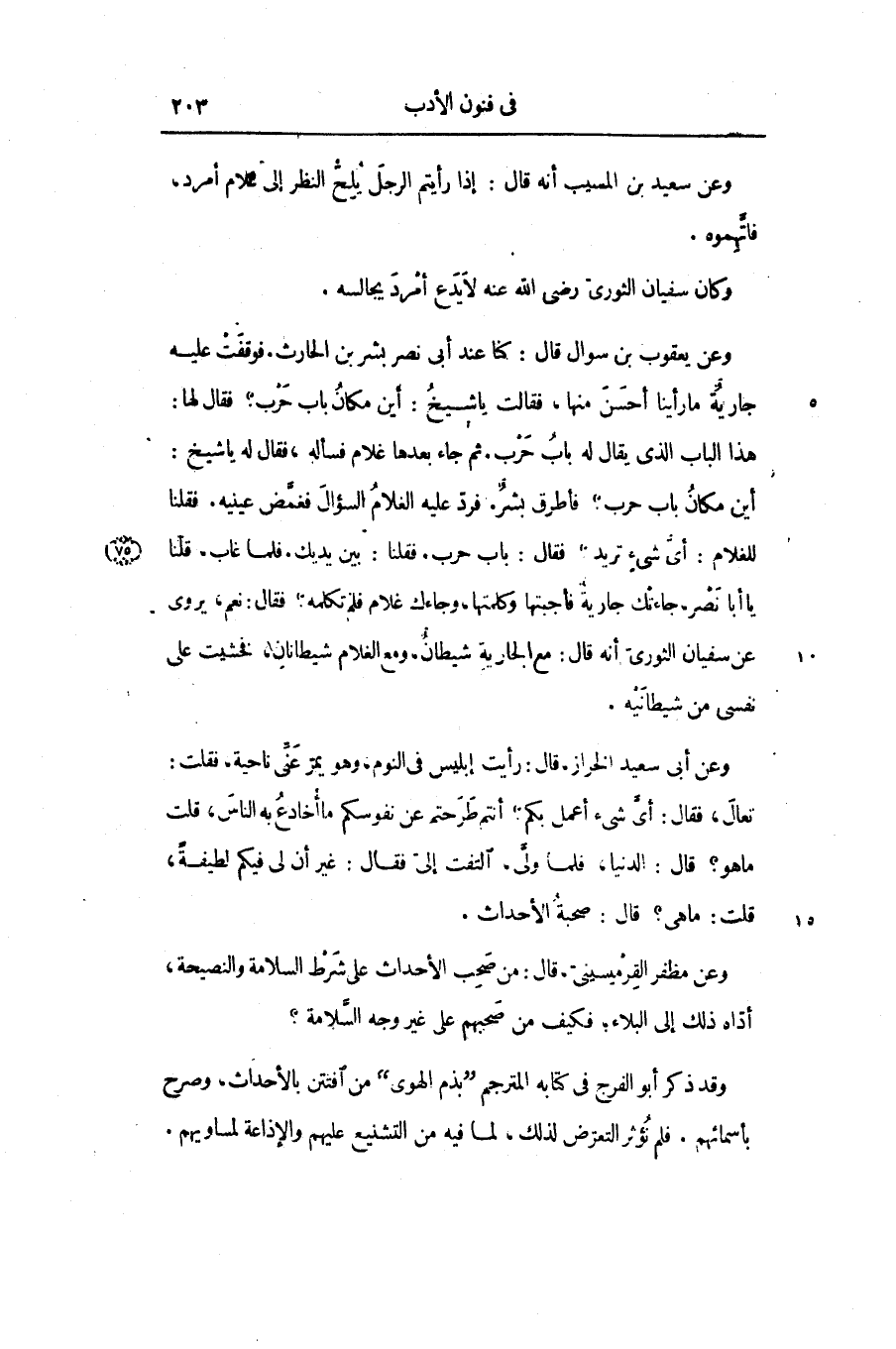 أين مكان باب حرب؟ فأطرق بشر. فردّ عليه الغلام السؤال فغمّض عينيه. فقلنا للغلام: أىّ شىء تريد فقال: باب حرب. فقلنا: بين يديك. فلما غاب، قلنا يا أبا نصر، جاءتك جارية فأجبتها وكلمتها، وجاءك غلام فلم تكلمه؟ فقال: نعم، يروى عن سفيان الثورىّ أنه قال: مع الجارية شيطان، ومع الغلام شيطانان، فخشيت على نفسى من شيطانيه.