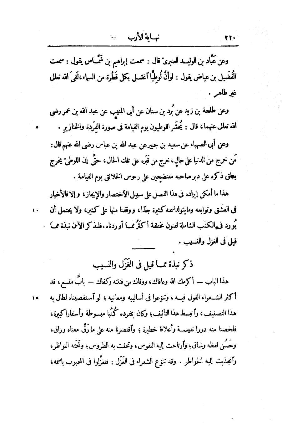 هذا ما أمكن إيراده في هذا الفصل على سبيل الاختصار والإيجاز، وإلا فالأخبار فى العشق وتوابعه وما يتولد عنه كثيرة جدّا، ووقفنا منها على كثير، ولا يحتمل أن يورد في الكتب الشاملة لفنون مختلفة أكثر مما أوردناه. فلنذكر الآن نبذة مما قيل في الغزل والنسيب.