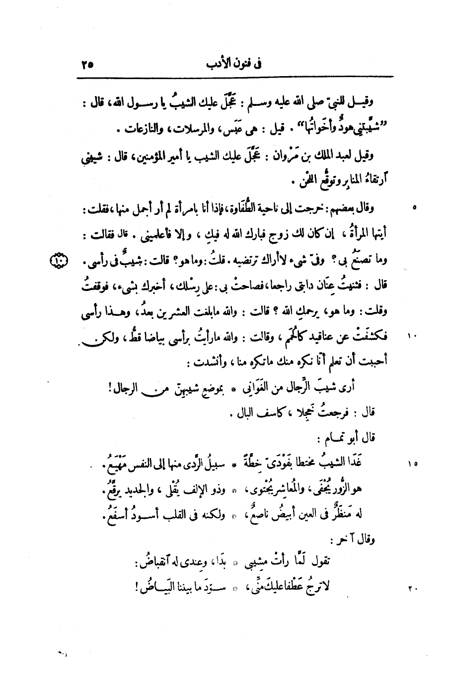 قال: فثنيت عنان دابتى راجعا، فصاحت بى: على رسلك، أخبرك بشىء، فوقفت وقلت: وما هو، يرحمك الله؟ قالت: والله ما بلغت العشرين بعد، وهذا رأسى فكشفت عن عناقيد كالحمم، وقالت: والله ما رأيت برأسى بياضا قطّ، ولكن أحببت أن تعلم أنّا نكره منك ما تكره منا، وأنشدت: