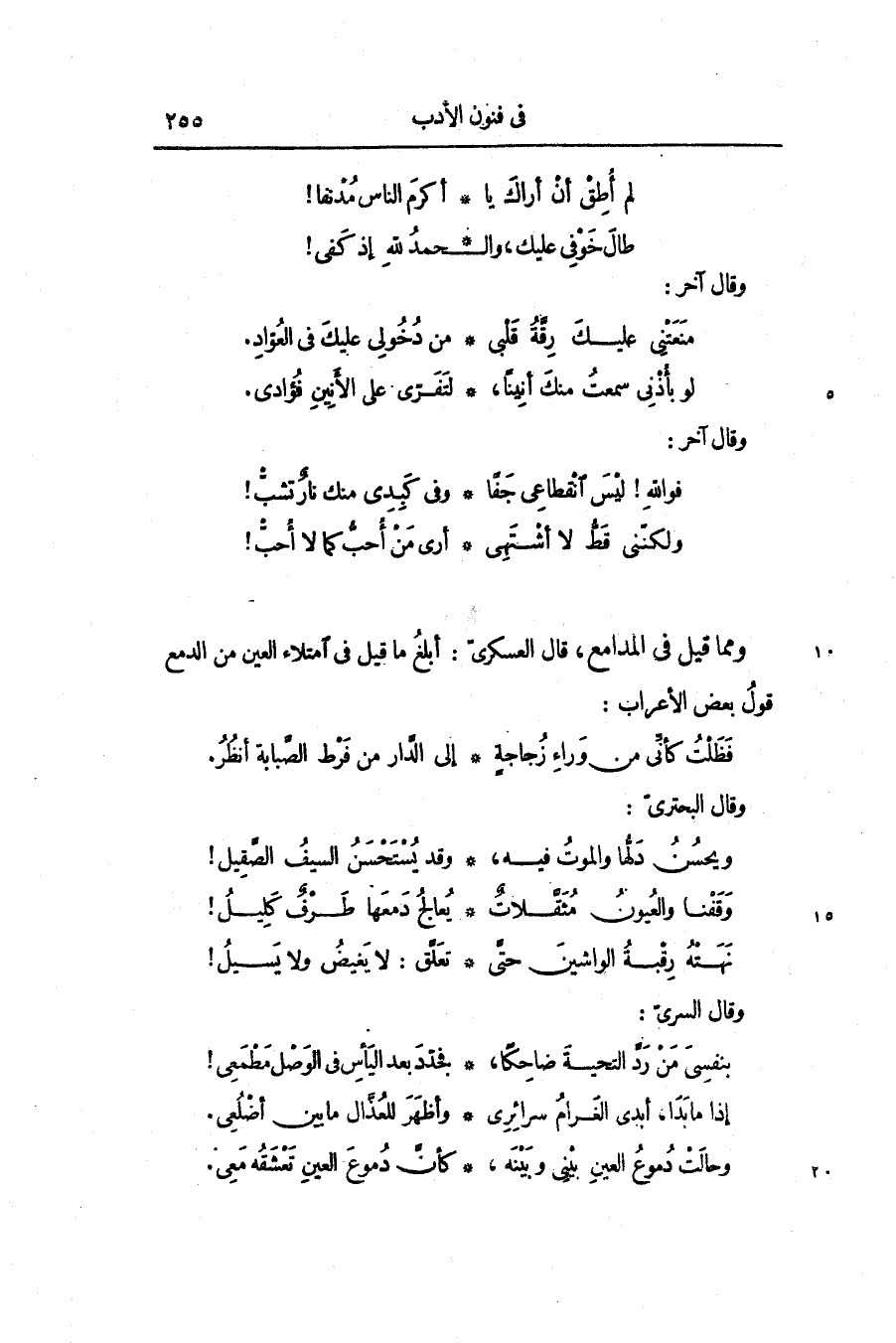 ومما قيل في المدامع، قال العسكرىّ: أبلغ ما قيل في امتلاء العين من الدمع قول بعض الأعراب: