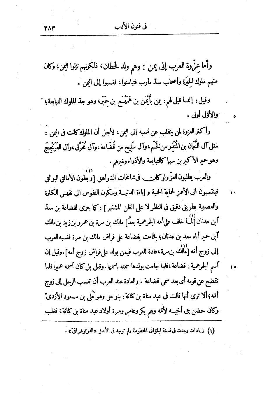والعرب يطلبون العزّ ولو كان في شامخات الشواهق [1] [وبطون الأمالق البوالق فينتسبون الى الأعز لحماية الحمية وإباءة الدنية وسكون النفوس الى نفيس الكثرة والعصبية بطريق دقيق في النظر لا على الظن المشتهر] : كما جرى لقضاعة بن معدّ ابن عدنان [2] [لما خلف على أمه الجرهمية بعد] مالك بن مرة بن عمرو بن زيد بن مالك ابن حمير أباه معد بن عدنان؛ فجاءت بقضاعة على فراش مالك بن مرة فنسبه العرب إلى زوج أمّه [3] [مالك بن مرة، عادة للعرب فيمن يولد على فراش زوج أمه] . وقيل إن اسم الجرهمية: قضاعة، فلما جاءت بولدها سمته باسمها. وقيل بل كان اسمه عميرا فلما تقضع عن قومه أى بعد سمى قضاعة. والعادة عند العرب أن تنسب الرجل إلى زوج أمّه؛ ألا ترى أنها قالت في عبد مناة بن كنانة: بنو على وهو على بن مسعود الأزدىّ وكان حضن بنى أخيه لأمّه وهم بكر وعامر ومرة أولاد عبد مناة بن كنانة، فغلب