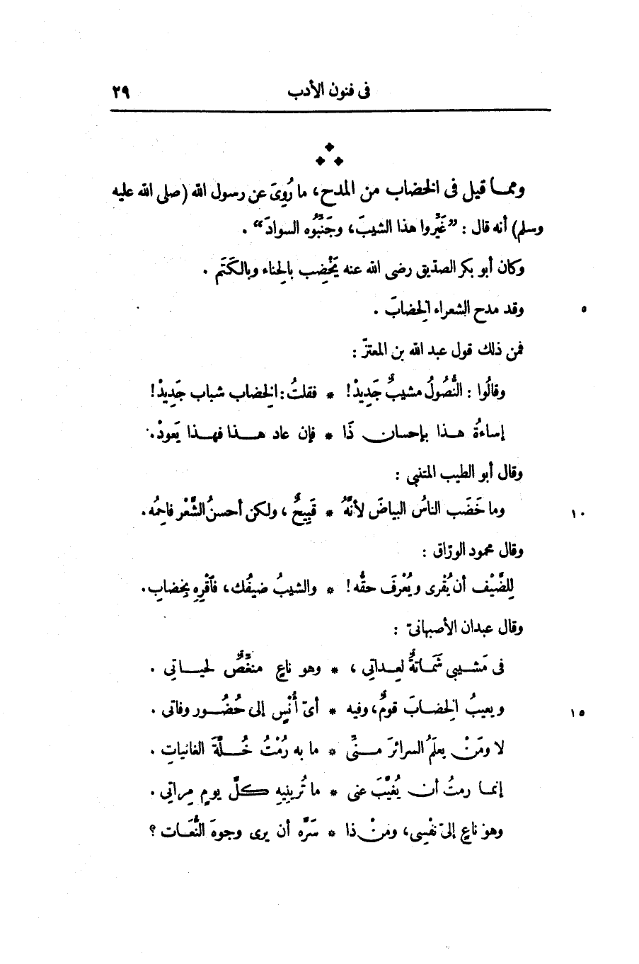 ويعيب الخضاب قوم، وفيه ... أىّ أنس إلى حضور وفاتى.
