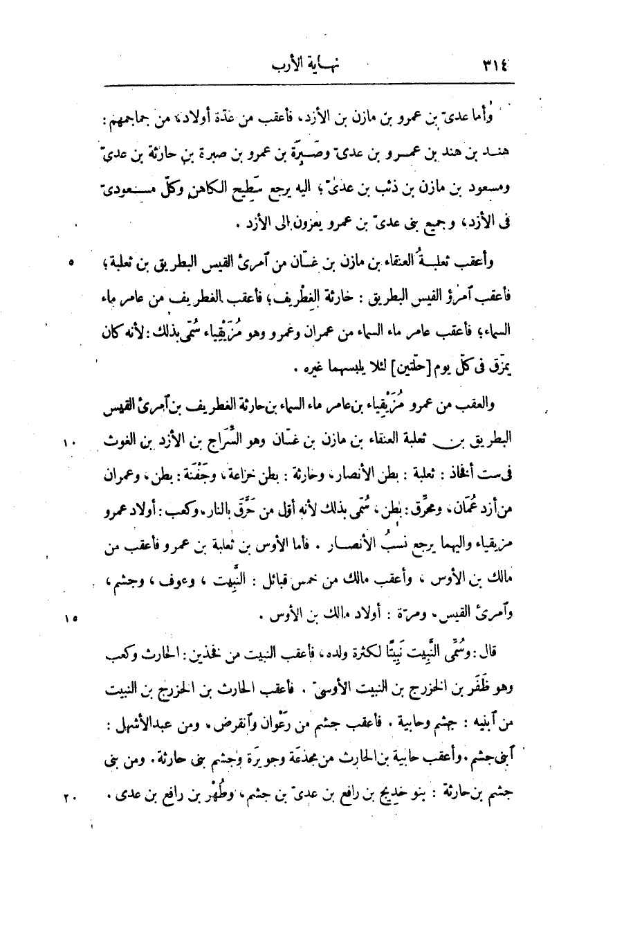 والعقب من عمرو مزيقياء بن عامر ماء السماء بن حارثة الغطريف بن امرئ القيس البطريق بن ثعلبة العنقاء بن مازن بن غسّان وهو السّراج بن الأزد بن الغوث فى ست أفخاذ: ثعلبة: بطن الأنصار، وحارثة: بطن خزاعة، وجفنة: بطن، وعمران من أزد عمان، ومحرّق: بطن، سمّى بذلك لأنه أوّل من حرّق بالنار، وكعب: أولاد عمرو مزيقياء واليهما يرجع نسب الأنصار. فأما الأوس بن ثعلبة بن عمرو فأعقب من مالك بن الأوس، وأعقب مالك من خمس قبائل: النّبيت، وعوف، وجشم، وامرئ القيس، ومرّة: أولاد مالك بن الأوس.