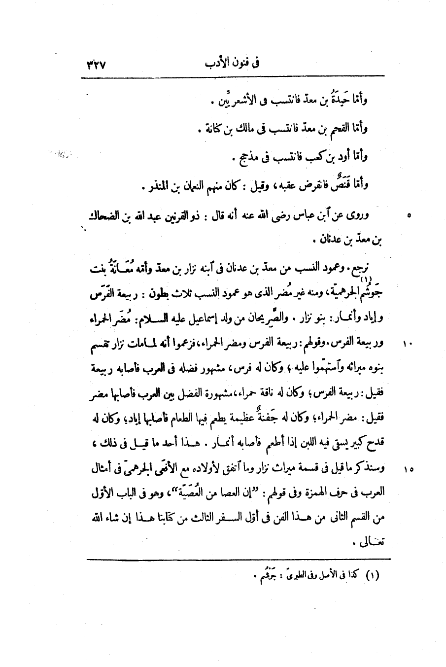 نرجع. وعمود النسب من معدّ بن عدنان في ابنه نزار بن معدّ وأمّه معانة بنت جوشم [1] الجرهميّة، ومنه غير مضر الذى هو عمود النسب ثلاث بطون: ربيعة الفرس وإياد وأنمار: بنو نزار. والصّريحان من ولد إسماعيل عليه السلام: مضر الحمراء وربيعة الفرس. وقولهم: ربيعة الفرس ومضر الحمراء، فزعموا أنه لما مات نزار تقسم بنوه ميراثه واستهمّوا عليه؛ وكان له فرس، مشهور فضله في العرب فأصابه ربيعة فقيل: ربيعة الفرس؛ وكان له ناقة حمراء، مشهورة الفضل بين العرب فأصابها مضر فقيل: مضر الحمراء؛ وكان له جفنة عظيمة يطعم فيها الطعام فأصابها إياد؛ وكان له قدح كبير يسقى فيه اللبن إذا أطعم فأصابه أنمار. هذا أحد ما قيل في ذلك، وسنذكر ما قيل في قسمة ميراث نزار وما اتفق لأولاده مع الأفعى الجرهمىّ في أمثال العرب في حرف الهمزة وفي قولهم: «إن العصا من العصيّة» ، وهو في الباب الأوّل من القسم الثانى من هذا الفن في أوّل السفر الثالث من كتابنا هذا إن شاء الله تعالى.