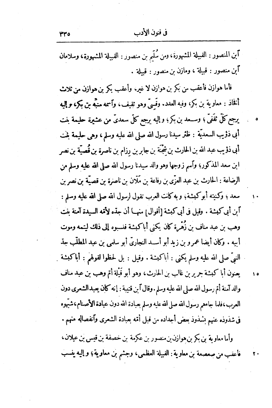 فأما هوازن فأعقب من بكر بن هوازن لا غير، وأعقب بكر بن هوازن من ثلاث أفخاذ: معاوية بن بكر، وفيه العدد، وقسىّ وهو ثقيف، واسمه منبّه بن بكر، وإليه يرجع كلّ ثقفىّ؛ وسعد بن بكر؛ وإليه يرجع كلّ سعدىّ من عشيرة حليمة بنت أبى ذؤيب السعديّة: ظئر سيدنا رسول الله صلى الله عليه وسلم، وهى حليمة بنت أبى ذؤيب عبد الله بن الحارث بن شجنة بن جابر بن رزام بن ناصرة بن قصيّة بن نصر ابن سعد المذكور؛ واسم زوجها وهو والد سيدنا رسول الله صلى الله عليه وسلم من الرضاعة: الحارث بن عبد العزّى بن رفاعة بن ملّان بن ناصرة بن قصيّة بن نصر بن سعد؛ وكنيته أبو كبشة؛ وبه كانت العرب تقول لرسول الله صلى الله عليه وسلم: