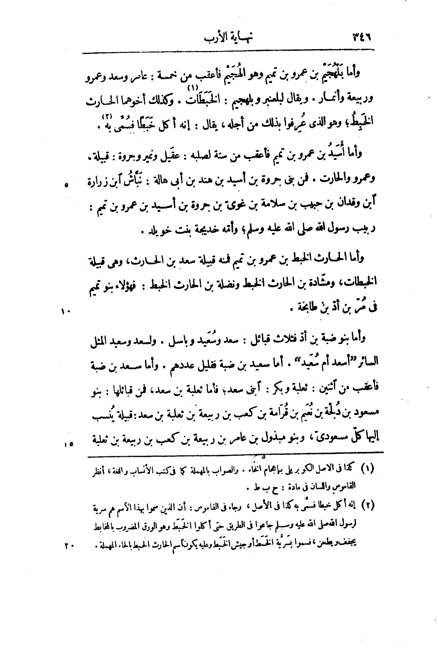 وأما الحارث الخبط بن عمرو بن تميم فمنه قبيلة سعد بن الحارث، وهى قبيلة الخبطات، ومشادة بن الحارث الخبط ونضلة بن الحارث الخبط: فهؤلاء بنو تميم فى مرّ بن أدّ بن طابخة.