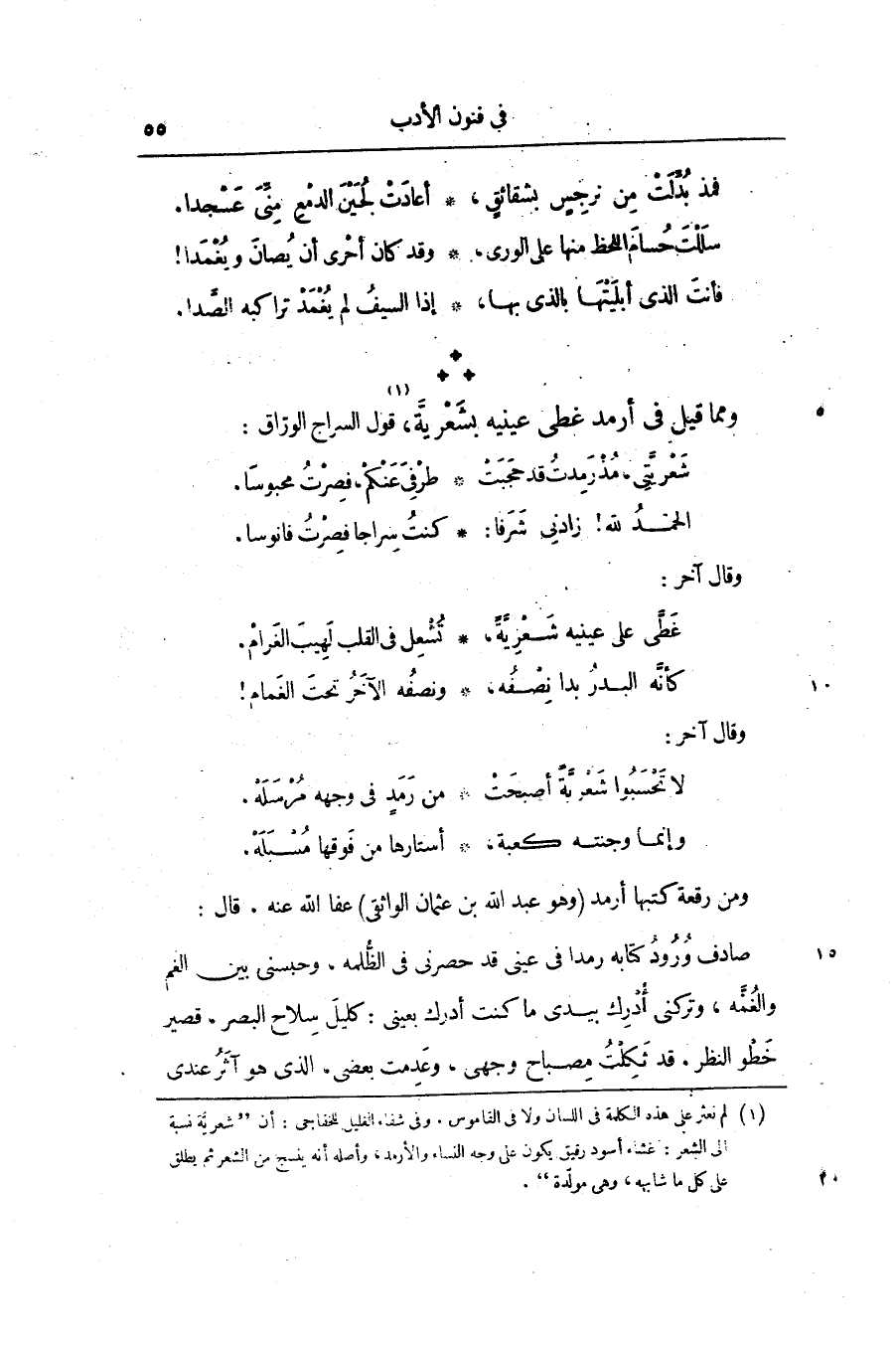 [1] لم نعثر على هذه الكلمة في اللسان ولا في القاموس. وفي شفاء الغليل للخفاجى: أن «شعريّة نسبة الى الشعر: غشاء أسود رقيق يكون على وجه النساء والأرمد، وأصله أنه ينسج من الشعر ثم يطلق على كل ما شابهه، وهى مولّدة» .