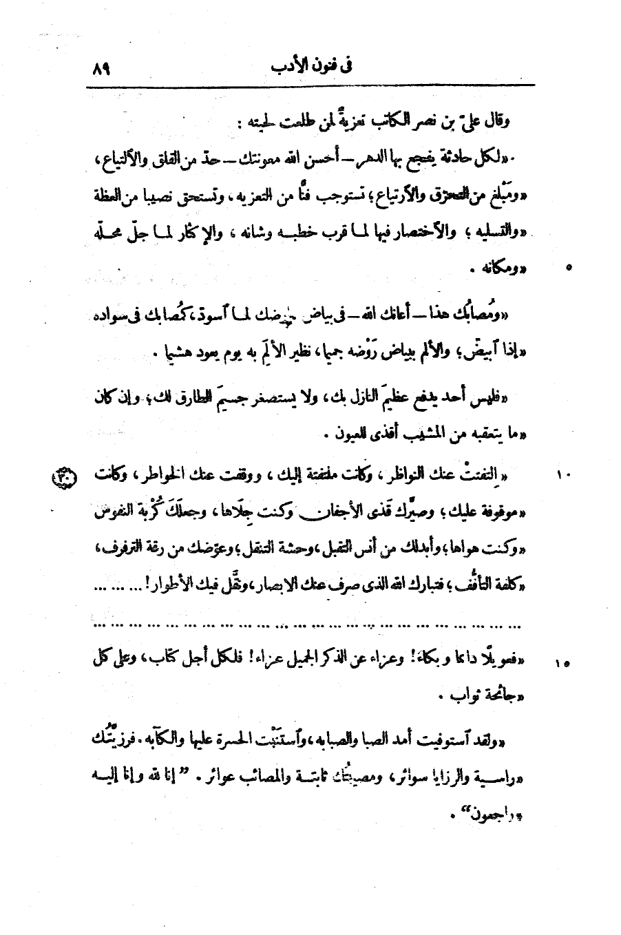 «ولقد استوفيت أمد الصبا والصبابه، واستنبت الحسرة عليها والكآبه. فرزيّتك «راسية والرزايا سوائر، ومصيبتك ثابتة والمصائب عوائر. «إنا لله وإنا إليه «راجعون» .