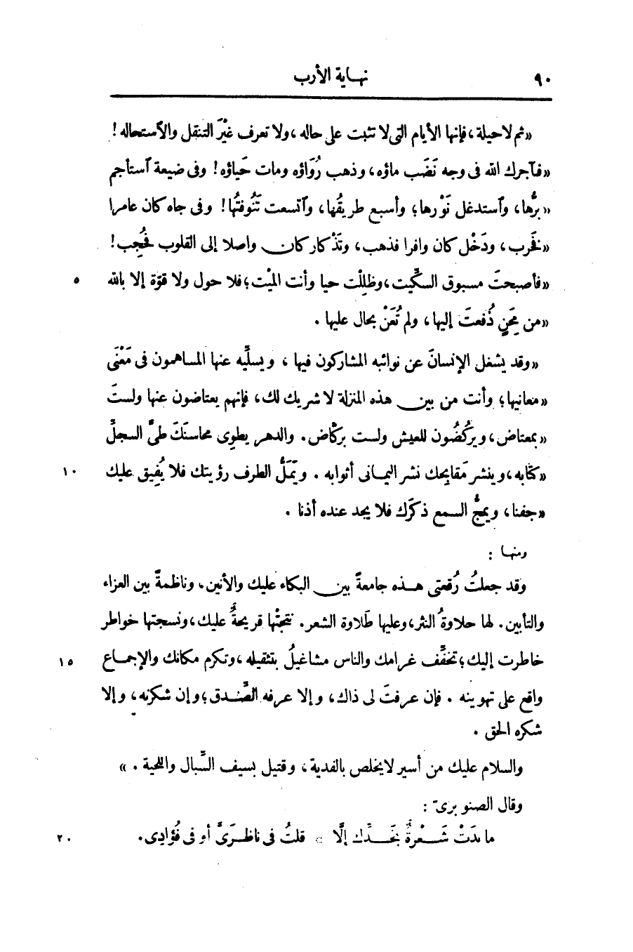 «ثم لا حيلة، فإنها الأيام التى لا تثبت على حاله، ولا تعرف غير التنقل والاستحاله! «فآجرك الله في وجه نضب ماؤه، وذهب رواؤه ومات حياؤه! وفي ضيعة استأجم «برّها، واستدغل نورها؛ وأسبع طريقها، واتسعت تنوفتها! وفي جاه كان عامرا «فخرب، ودخل كان وافرا فذهب، وتذكار كان واصلا إلى القلوب فحجب! «فأصبحت مسبوق السكّيت، وظللت حيا وأنت الميت؛ فلا حول ولا قوّة إلا بالله «من محن ذفعت إليها، ولم تعن بحال عليها.