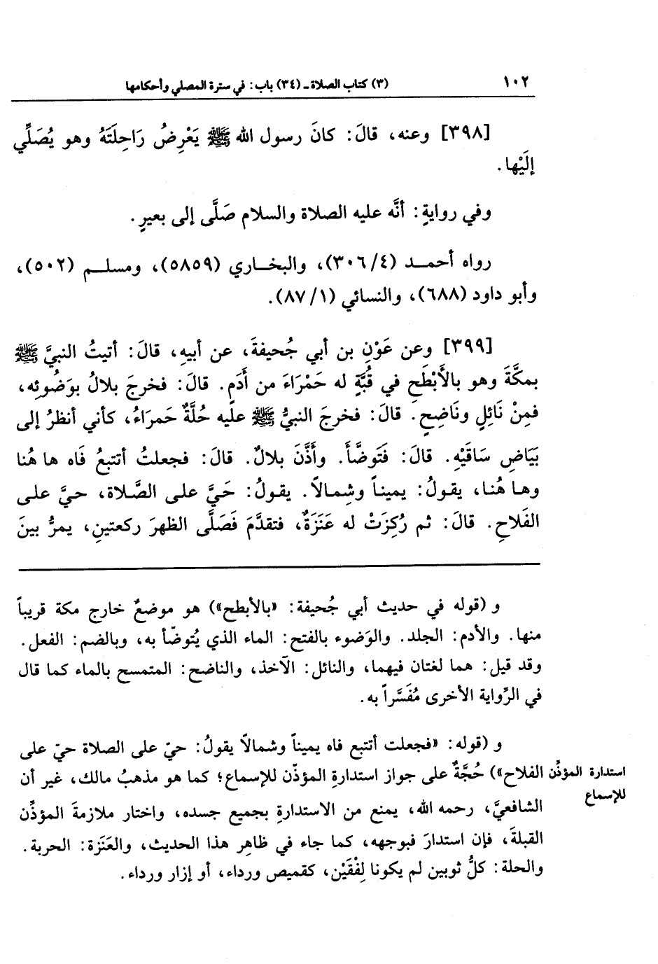 [399]- وَعَن عَون بن أَبِي جُحَيفَةَ عَن أَبِيهِ، قَالَ: أَتَيتُ النَّبِيَّ - صلى الله عليه وسلم - بِمَكَّةَ وَهُوَ بالأَبطَحِ فِي قُبَّةٍ لَهُ حَمرَاءَ مِن أَدَمٍ. قَالَ: فَخَرَجَ بِلالٌ بِوَضُوئِهِ، فَمِن نَائِلٍ وَنَاضِحٍ. قَالَ: فَخَرَجَ النَّبِيُّ - صلى الله عليه وسلم - عَلَيهِ حُلَّةٌ حَمرَاءُ، كَأَنِّي أَنظُرُ إِلَى بَيَاضِ سَاقَيهِ. قَالَ: فَتَوَضَّأَ. وَأَذَّنَ بِلالٌ. قَالَ: فَجَعَلتُ أَتَتَبَّعُ فَاهُ هَا هُنَا وَهَا هُنَا، يَقُولُ يَمِينًا وَشِمَالا. يَقُولُ: حَيَّ عَلَى الصَّلاةِ، حَيَّ عَلَى الفَلاحِ. قَالَ: ثُمَّ رُكِزَت لَهُ عَنَزَةٌ، فَتَقَدَّمَ فَصَلَّى الظُّهرَ رَكعَتَينِ، يَمُرُّ بَينَ