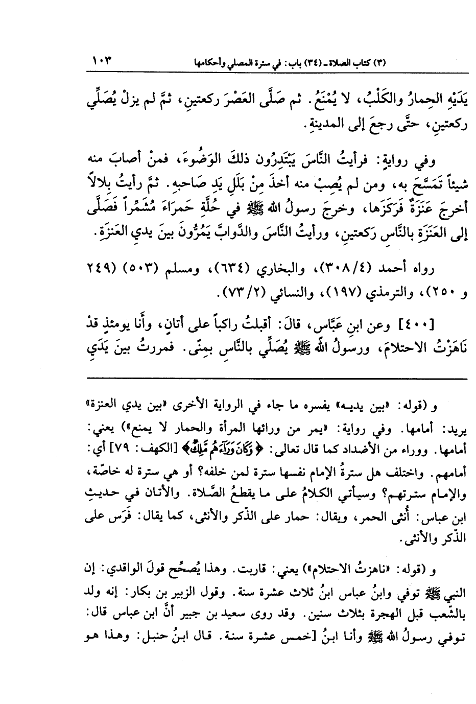 [400]- وَعَنِ ابنِ عَبَّاسٍ، قَالَ: أَقبَلتُ رَاكِبًا عَلَى أَتَانٍ، وَأَنَا يَومَئِذٍ قَد نَاهَزتُ الاحتِلامَ، وَرَسُولُ اللهِ - صلى الله عليه وسلم - يُصَلِّي بِالنَّاسِ بِمِنًى. فَمَرَرتُ بَينَ يَدَيِ