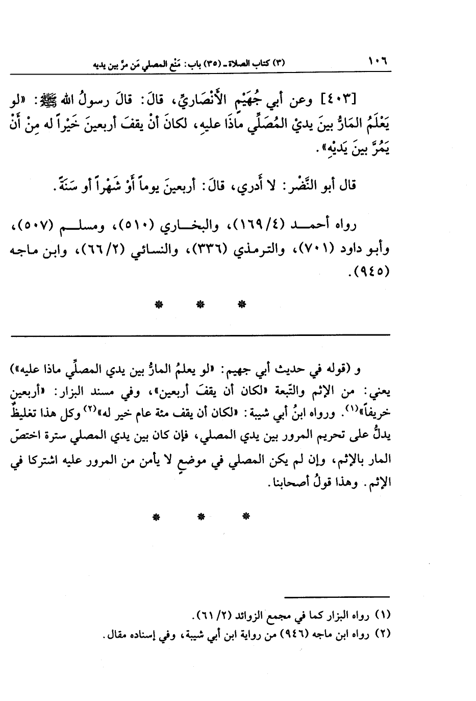 [403]- وَعَنِ أَبِي جُهَيمٍ الأَنصَارِيِّ، قَالَ: قَالَ رَسُولُ اللهِ - صلى الله عليه وسلم -: لَو يَعلَمُ المَارُّ بَينَ يَدَيِ المُصَلِّي مَاذَا عَلَيهِ، لَكَانَ أَن يَقِفَ أَربَعِينَ خَيرًا لَهُ مِن أَن يَمُرَّ بَينَ يَدَيهِ.