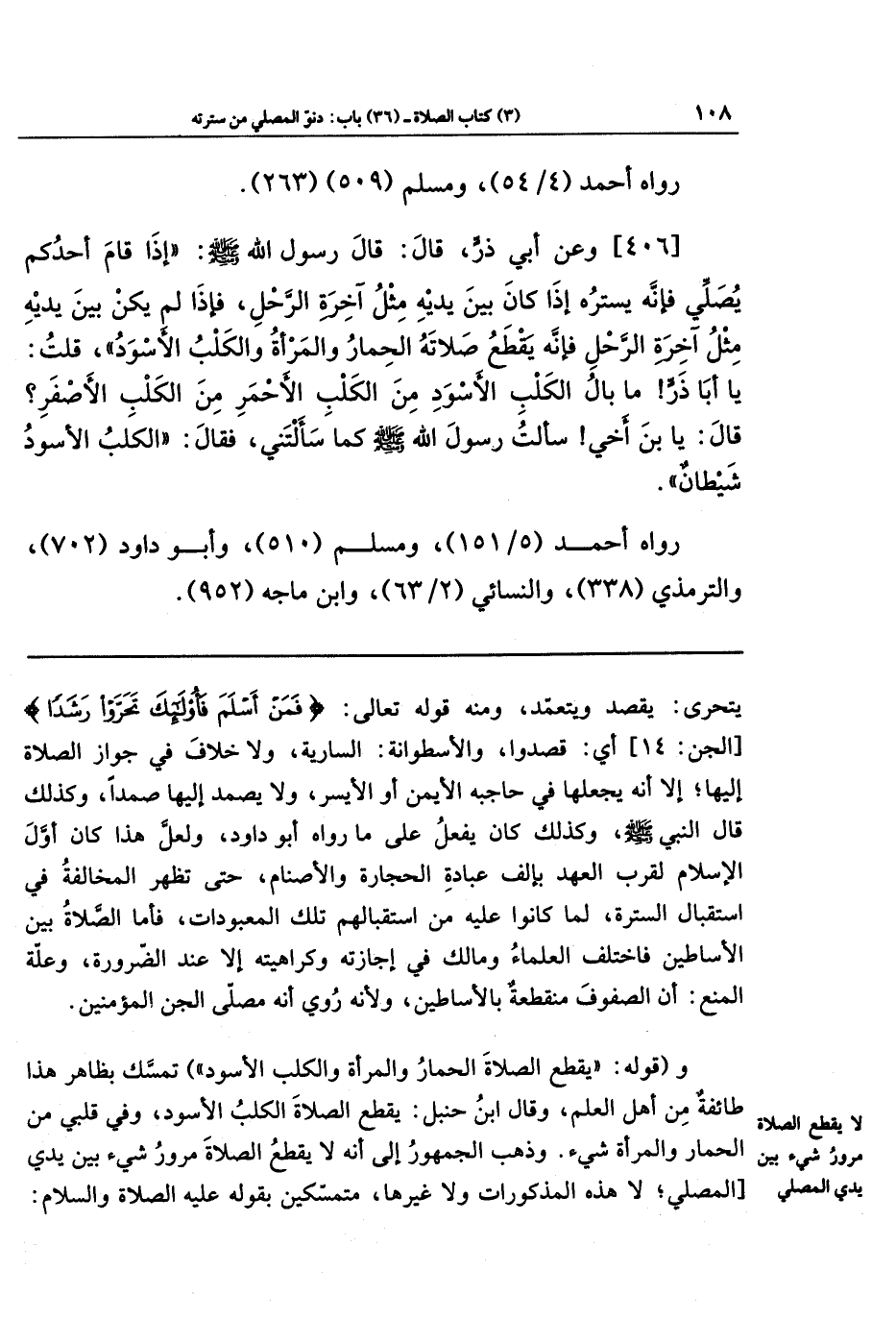 [406] وَعَن أَبِي ذَرٍّ، قَالَ: قَالَ رَسُولُ اللهِ - صلى الله عليه وسلم -: إِذَا قَامَ أَحَدُكُم يُصَلِّي فَإِنَّهُ يَستُرُهُ إِذَا كَانَ بَينَ يَدَيهِ مِثلُ آخِرَةِ الرَّحلِ، فَإِذَا لَم يَكُن بَينَ يَدَيهِ مِثلُ آخِرَةِ الرَّحلِ فَإِنَّهُ يَقطَعُ صَلاتَهُ الحِمَارُ وَالمَرأَةُ وَالكَلبُ الأَسوَدُ، قُلتُ: يَا أَبَا ذَرٍّ! مَا بَالُ الكَلبِ الأَسوَدِ مِنَ الكَلبِ الأَحمَرِ مِنَ الكَلبِ الأَصفَرِ؟ قَالَ: يَا ابنَ أَخِي سَأَلتُ رَسُولَ اللهِ - صلى الله عليه وسلم - كَمَا سَأَلتَنِي، فَقَالَ: الكَلبُ الأَسوَدُ شَيطَانٌ.