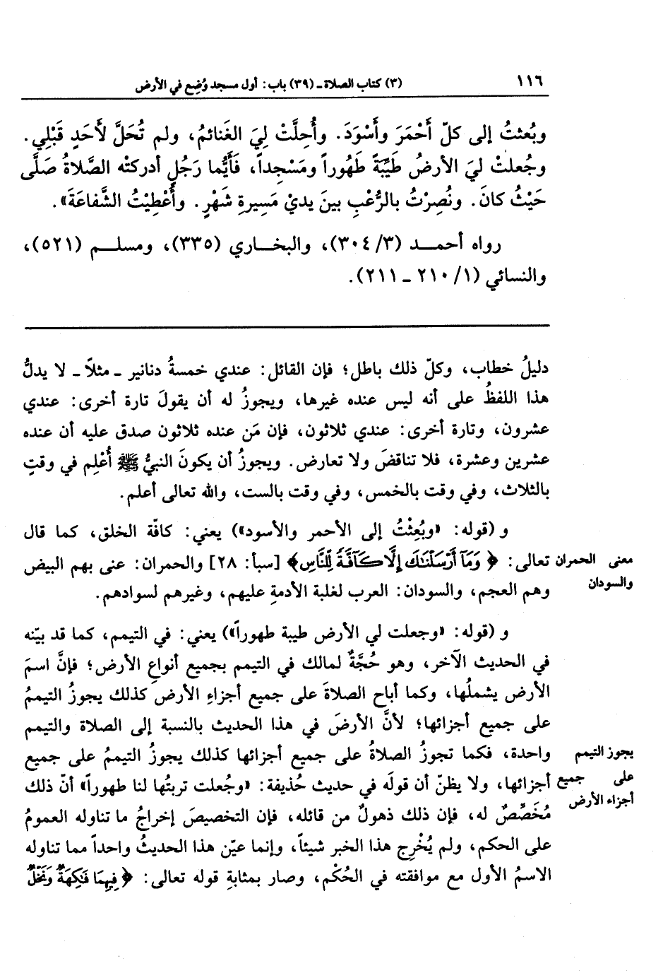 وَبُعِثتُ إِلَى كُلِّ أَحمَرَ وَأَسوَدَ، وَأُحِلَّت لِيَ الغَنَائِمُ وَلَم تُحَلَّ لأَحَدٍ قَبلِي، وَجُعِلَت لِيَ الأَرضُ طَيِّبَةً طَهُورًا وَمَسجِدًا، فَأَيُّمَا رَجُلٍ أَدرَكَتهُ الصَّلاةُ صَلَّى حَيثُ كَانَ، وَنُصِرتُ بِالرُّعبِ بَينَ يَدَي مَسِيرَةِ شَهرٍ، وَأُعطِيتُ الشَّفَاعَةَ.
