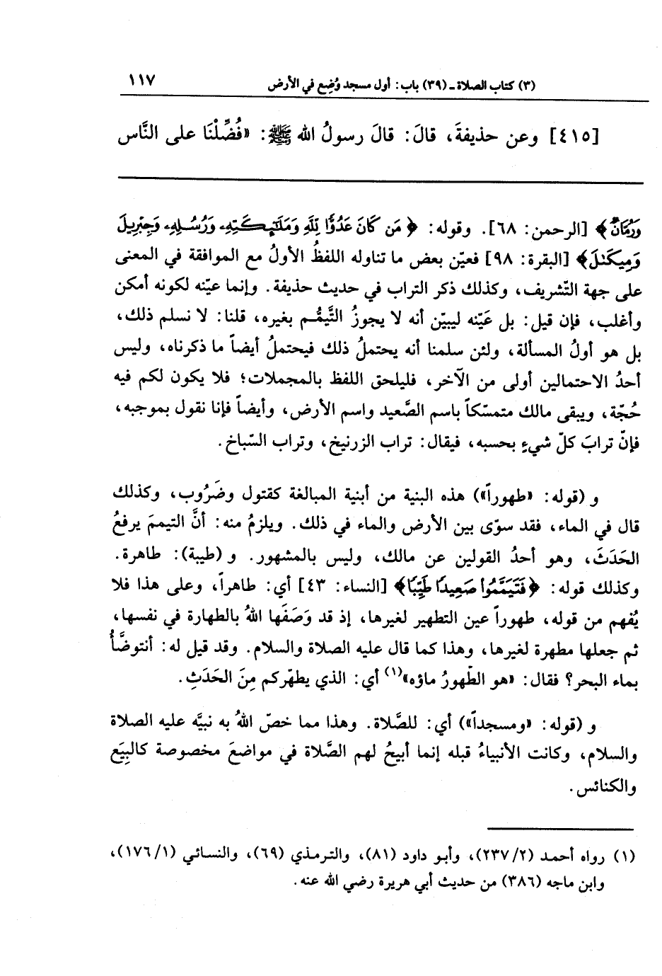 [415]- وَعَن حُذَيفَةَ قَالَ: قَالَ رَسُولُ اللَّهِ - صلى الله عليه وسلم -: فُضِّلنَا عَلَى النَّاسِ