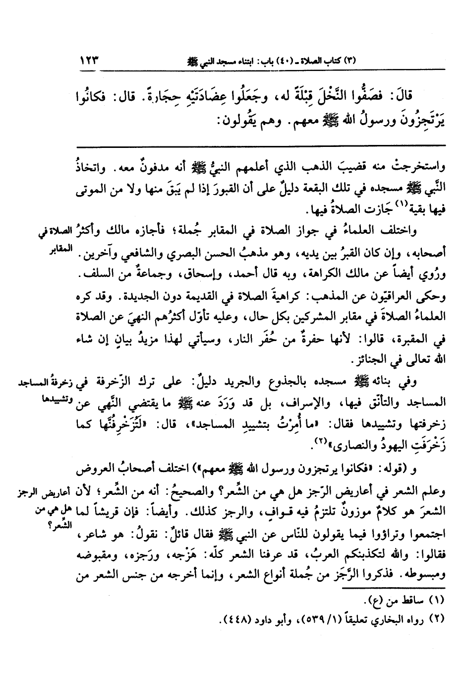 وفي بنائه - صلى الله عليه وسلم - مسجده بالجذوع والجريد دليل على ترك الزخرفة في المساجد والتأنق فيها، والإسراف. بل قد ورد عنه - صلى الله عليه وسلم - ما يقتضي النهي عن زخرفتها وتشييدها، فقال: ما أُمِرتُ بتشييد المساجد، قال: لتزخرفُنَّها كما زخرفت اليهود والنصارى (¬2).
