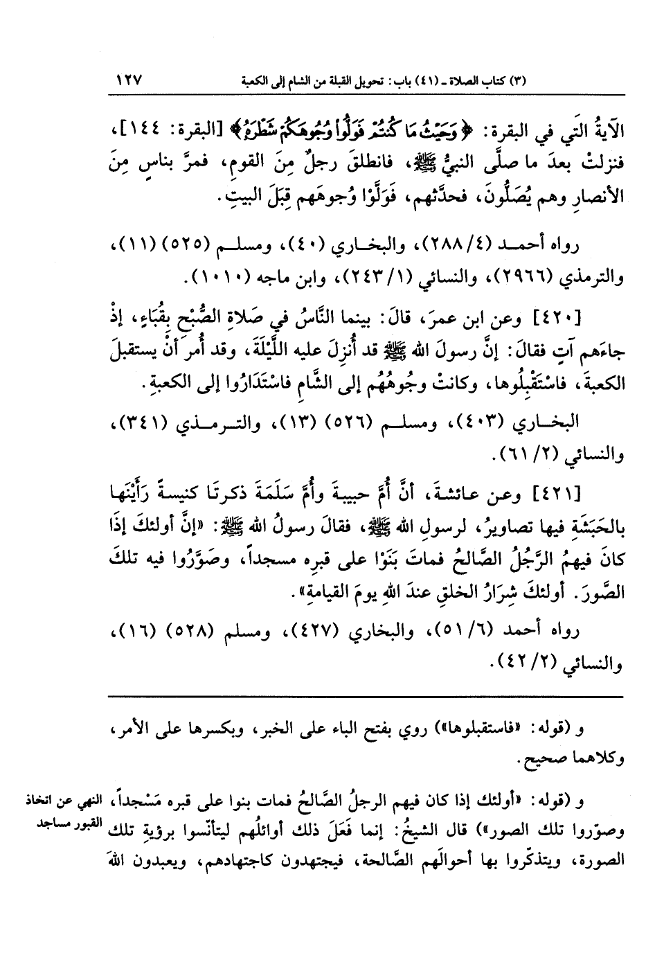[420]- وعَنِ ابنِ عُمَرَ قَالَ: بَينَمَا النَّاسُ فِي صَلاةِ الصُّبحِ بِقُبَاءٍ، إِذ جَاءَهُم آتٍ فَقَالَ: إِنَّ رَسُولَ اللَّهِ - صلى الله عليه وسلم - قَد أُنزِلَ عَلَيهِ اللَّيلَةَ، وَقَد أُمِرَ أَن يَستَقبِلَ الكَعبَةَ، فَاستَقبَلُوهَا وَكَانَت وُجُوهُهُم إِلَى الشَّامِ، فَاستَدَارُوا إِلَى الكَعبَةِ.