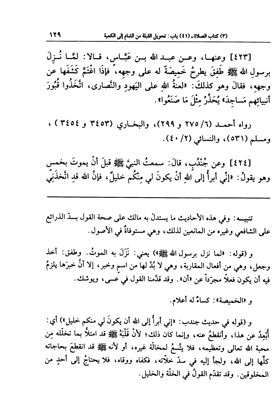 [423]- وَعَنهَا وَعَن عبد الله بنِ عَبَّاسٍ قَالا: لَمَّا نُزِلَ بِرَسُولِ اللَّهِ - صلى الله عليه وسلم - طَفِقَ يَطرَحُ خَمِيصَةً لَهُ عَلَى وَجهِهِ، فَإِذَا اغتَمَّ كَشَفَهَا عَن وَجهِهِ، فَقَالَ وَهُوَ كَذَلِكَ: لَعنَةُ اللَّهِ عَلَى اليَهُودِ وَالنَّصَارَى، اتَّخَذُوا قُبُورَ أَنبِيَائِهِم مَسَاجِدَ. يُحَذِّرُ مِثلَ مَا صَنَعُوا.