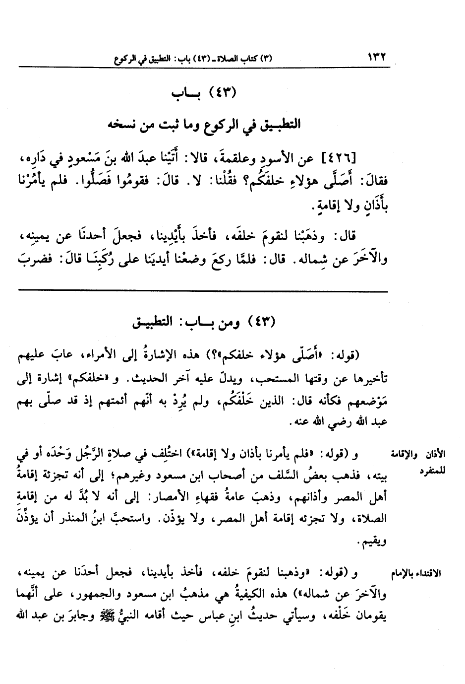 [426]- عَنِ الأَسوَدِ وَعَلقَمَةَ، قَالا: أَتَينَا عبد الله بنَ مَسعُودٍ فِي دَارِهِ فَقَالَ: أَصَلَّى هَؤُلاءِ خَلفَكُم؟ فَقُلنَا: لا. قَالَ: فَقُومُوا فَصَلُّوا، فَلَم يَأمُرنَا بِأَذَانٍ وَلا إِقَامَةٍ.