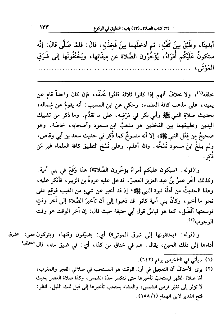 أَيدِيَنَا، وَطَبَّقَ بَينَ كَفَّيهِ، ثُمَّ أَدخَلَهُمَا بَينَ فَخِذَيهِ، قال: فَلَمَّا صَلَّى قَالَ: إِنَّهُ سَتَكُونُ عَلَيكُم أُمَرَاءُ يُؤَخِّرُونَ الصَّلاةَ عَن مِيقَاتِهَا، وَيَخنُقُونَهَا إِلَى شَرَقِ المَوتَى،