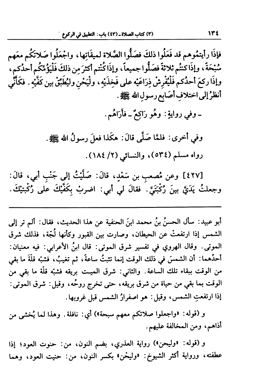 [427]- وَعَن مُصعَبِ بنِ سَعدٍ، قَالَ: صَلَّيتُ إِلَى جَنبِ أَبِي، قَالَ: وَجَعَلتُ يَدَيَّ بَينَ رُكبَتَيَّ. فَقَالَ لِي أَبِي: اضرِب بِكَفَّيكَ عَلَى رُكبَتَيكَ.
