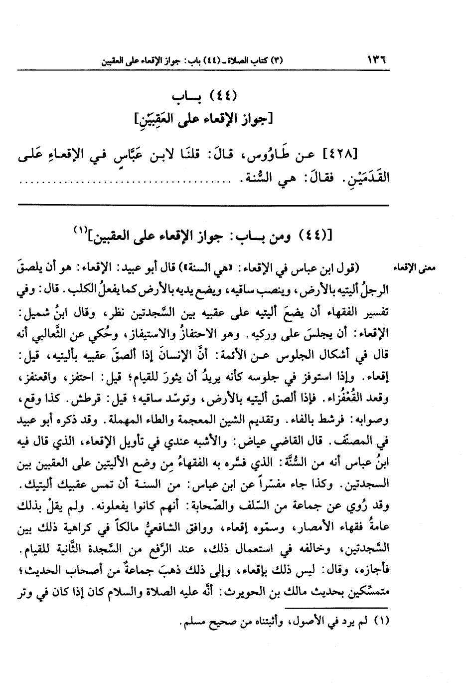 [428]- عَن طاوس قَالَ: قُلنَا لابنِ عَبَّاسٍ فِي الإِقعَاءِ عَلَى القَدَمَينِ، فَقَالَ: هِيَ السُّنَّةُ.