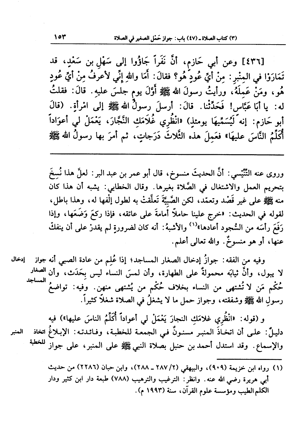 [436]- وعَن أَبِي حَازِمٍ: أَنَّ نَفَرًا جَاؤوا إِلَى سَهلِ بنِ سَعدٍ، قَد تَمَارَوا فِي المِنبَرِ: مِن أَيِّ عُودٍ هُوَ؟ فَقَالَ: أَمَا وَاللَّهِ إِنِّي لأَعرِفُ مِن أَيِّ عُودٍ هُوَ، وَمَن عَمِلَهُ، وَرَأَيتُ رَسُولَ اللَّهِ - صلى الله عليه وسلم - أَوَّلَ يَومٍ جَلَسَ عَلَيهِ. قَالَ: فَقُلتُ لَهُ: يَا أَبَا عَبَّاسٍ! فَحَدِّثنَا. قَالَ: أَرسَلَ رَسُولُ اللَّهِ - صلى الله عليه وسلم - إِلَى امرَأَةٍ (قَالَ أَبُو حَازِمٍ: إِنَّهُ لَيُسَمِّيهَا يَومَئِذٍ) انظُرِي غُلامَكِ النَّجَّارَ يَعمَل لِي أَعوَادًا أُكَلِّمُ النَّاسَ عَلَيهَا، فَعَمِلَ هَذِهِ الثَّلاثَ دَرَجَاتٍ، ثُمَّ أَمَرَ بِهَا رَسُولُ اللَّهِ - صلى الله عليه وسلم -