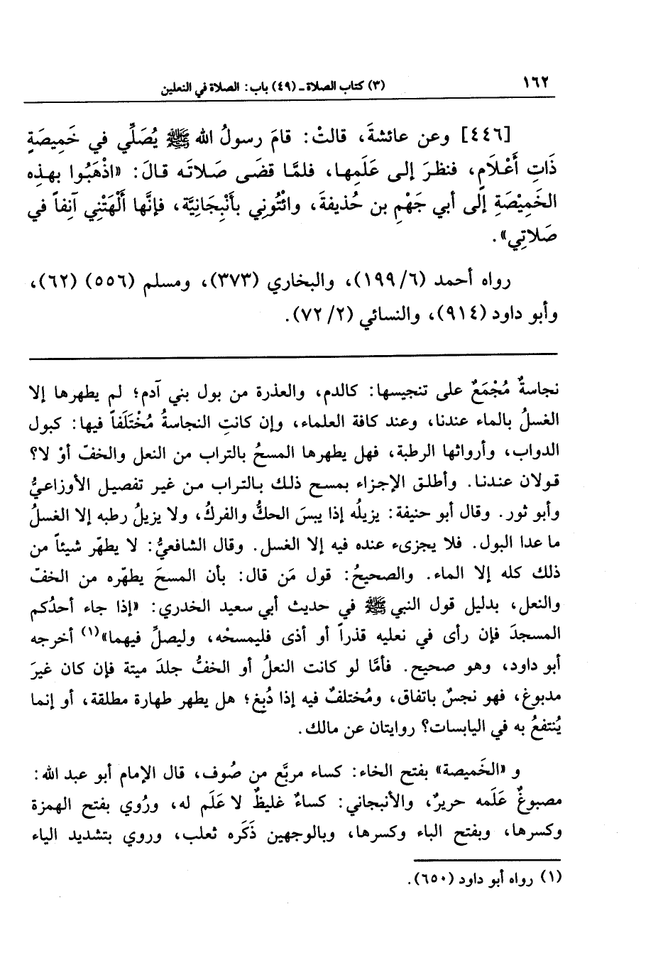 [446]- وعَن عَائِشَةَ قَالَت: قَامَ رَسُولُ اللَّهِ - صلى الله عليه وسلم - يُصَلِّي فِي خَمِيصَةٍ ذَاتِ أَعلامٍ، فَنَظَرَ إِلَى عَلَمِهَا، فَلَمَّا قَضَى صَلاتَهُ قَالَ: اذهَبُوا بِهَذِهِ الخَمِيصَةِ إِلَى أَبِي جَهمِ بنِ حُذَيفَةَ وَائتُونِي بِأَنبِجَانِيَّةِ، فَإِنَّهَا أَلهَتنِي آنِفًا فِي صَلاتِي.