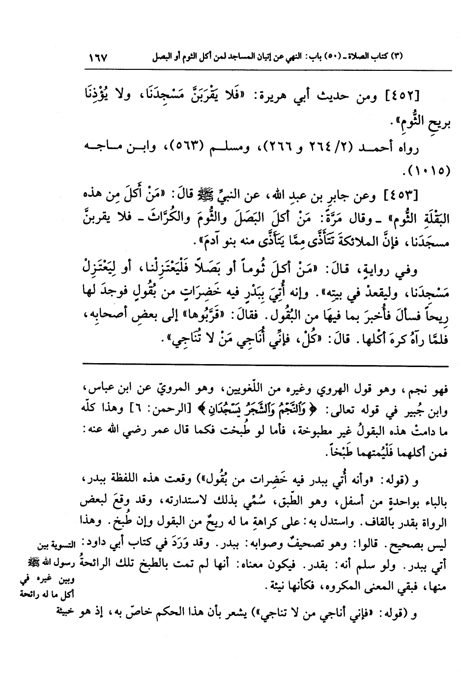 [452]- وَمِن حَدِيثِ أَبِي هُرَيرَةَ: فَلا يَقرَبَنَّ مَسجِدَنَا، وَلا يُؤذِنَا بِرِيحِ الثُّومِ.